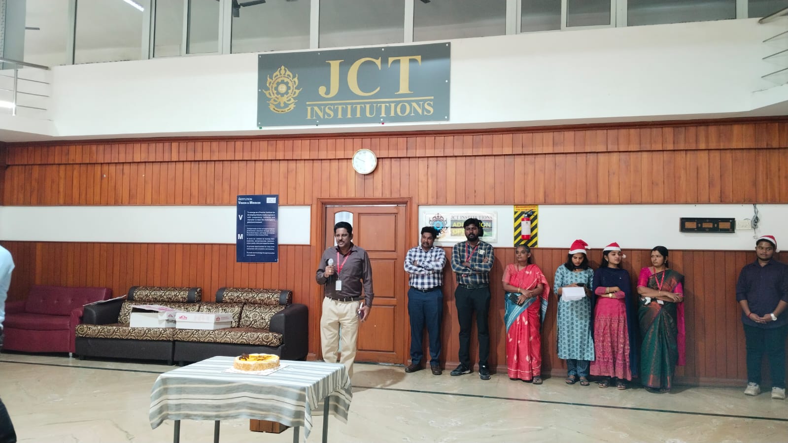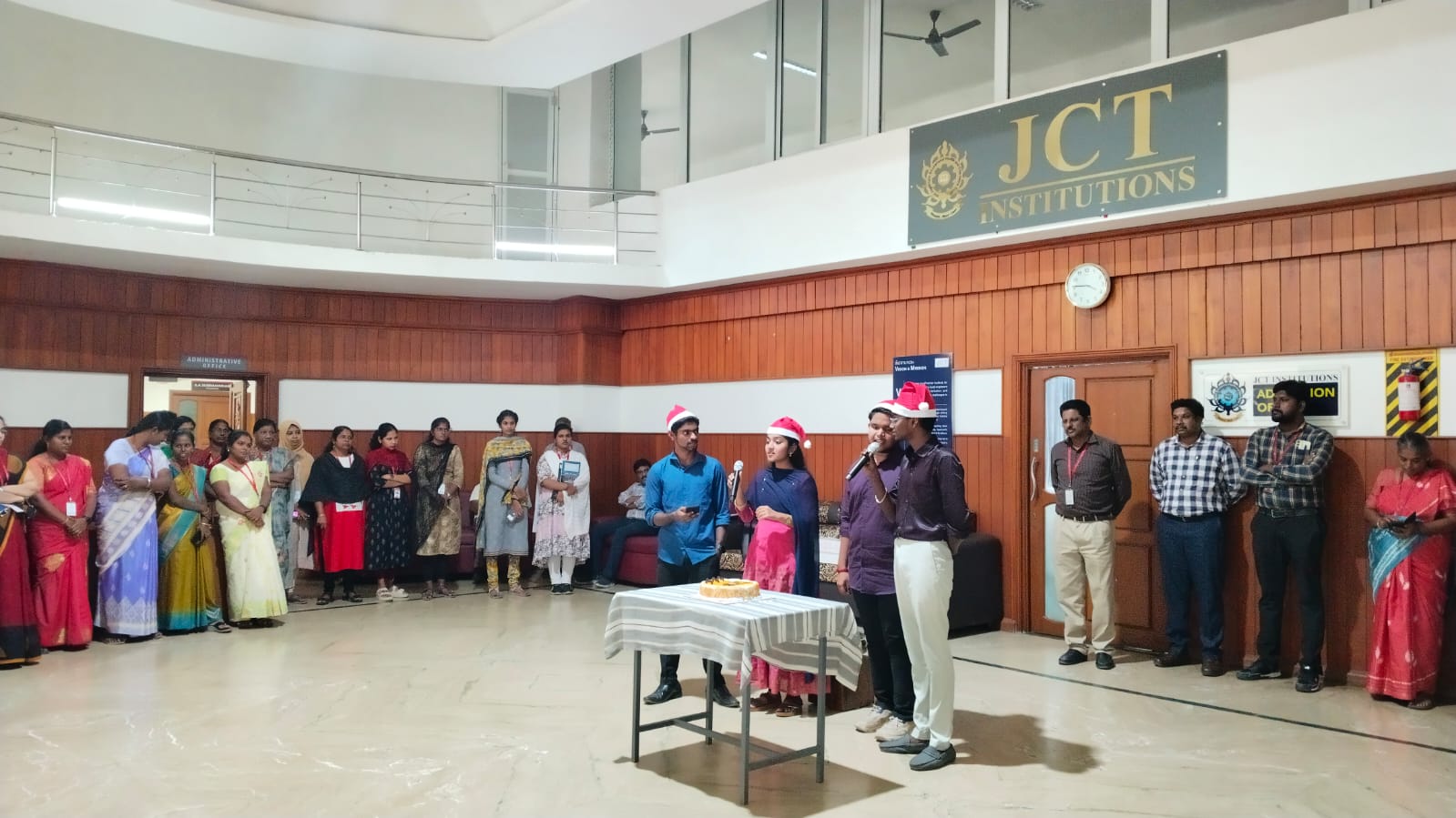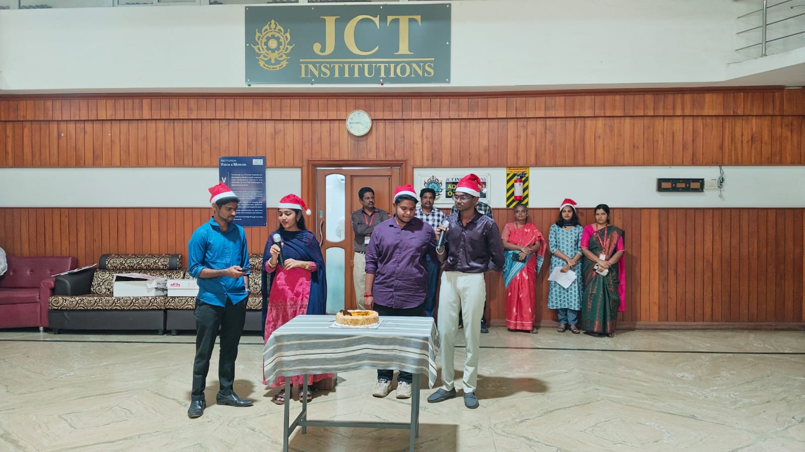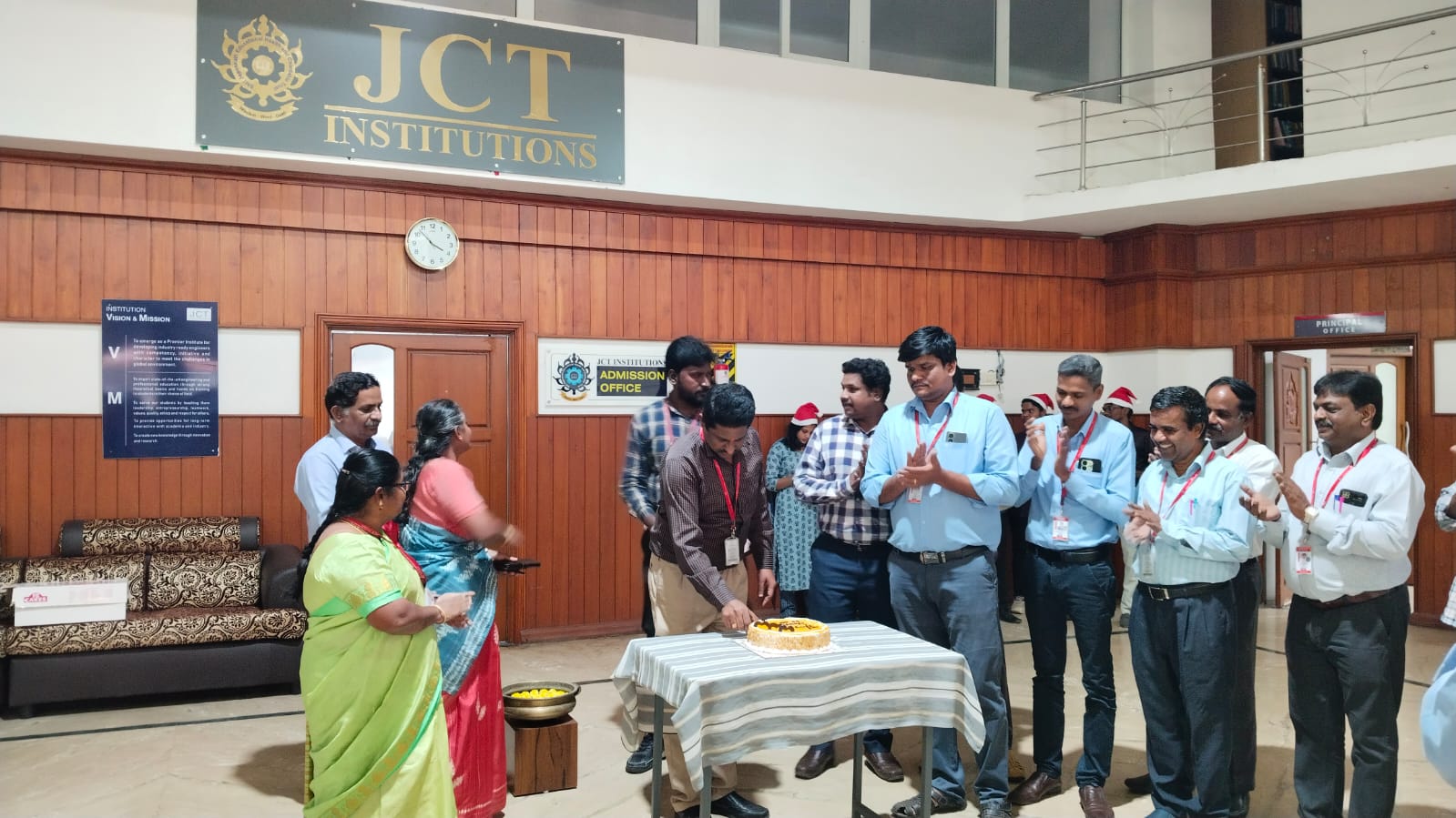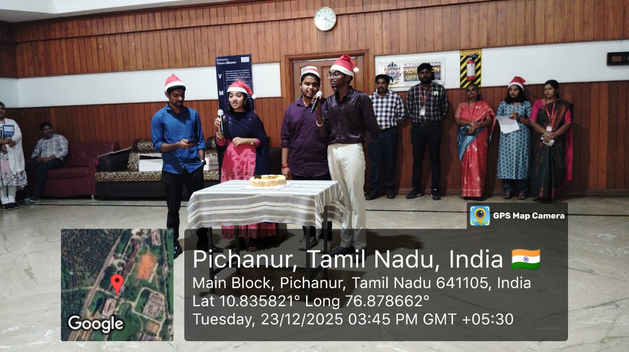 “CHRISTMAS DAY CELEBRATION” took place at JCT College of Engineering and Technology on 23.12.2025. Our Principal Dr. S. Manoharan took part in this event, sliced the cake, addressed the gathering, and mentioned that Jesus lived for others. He additionally mentioned that Jesus endured pain for others, died for them, loved even his crucifiers, and requested forgiveness on their behalf. Christmas is not only about gifts, ornaments, and festive celebrations but also about sharing love and kindness. During this time, individuals participate in charitable actions, assisting those in need and representing the genuine essence of generosity and following the example of Jesus.