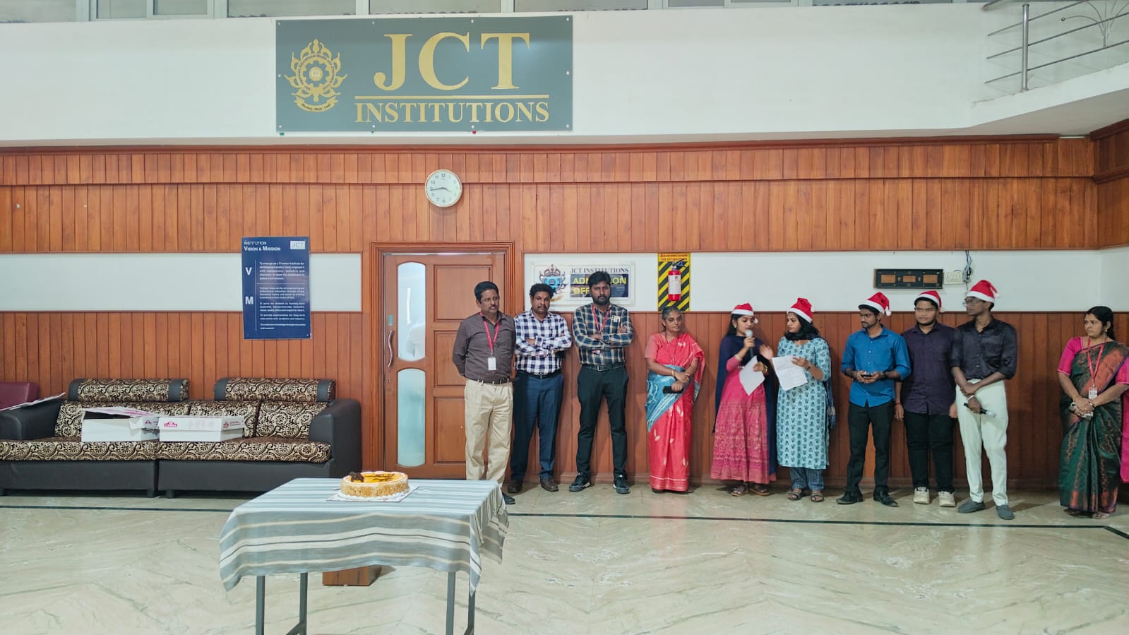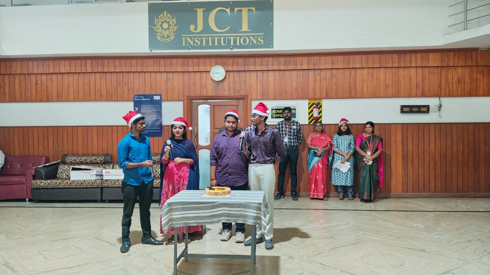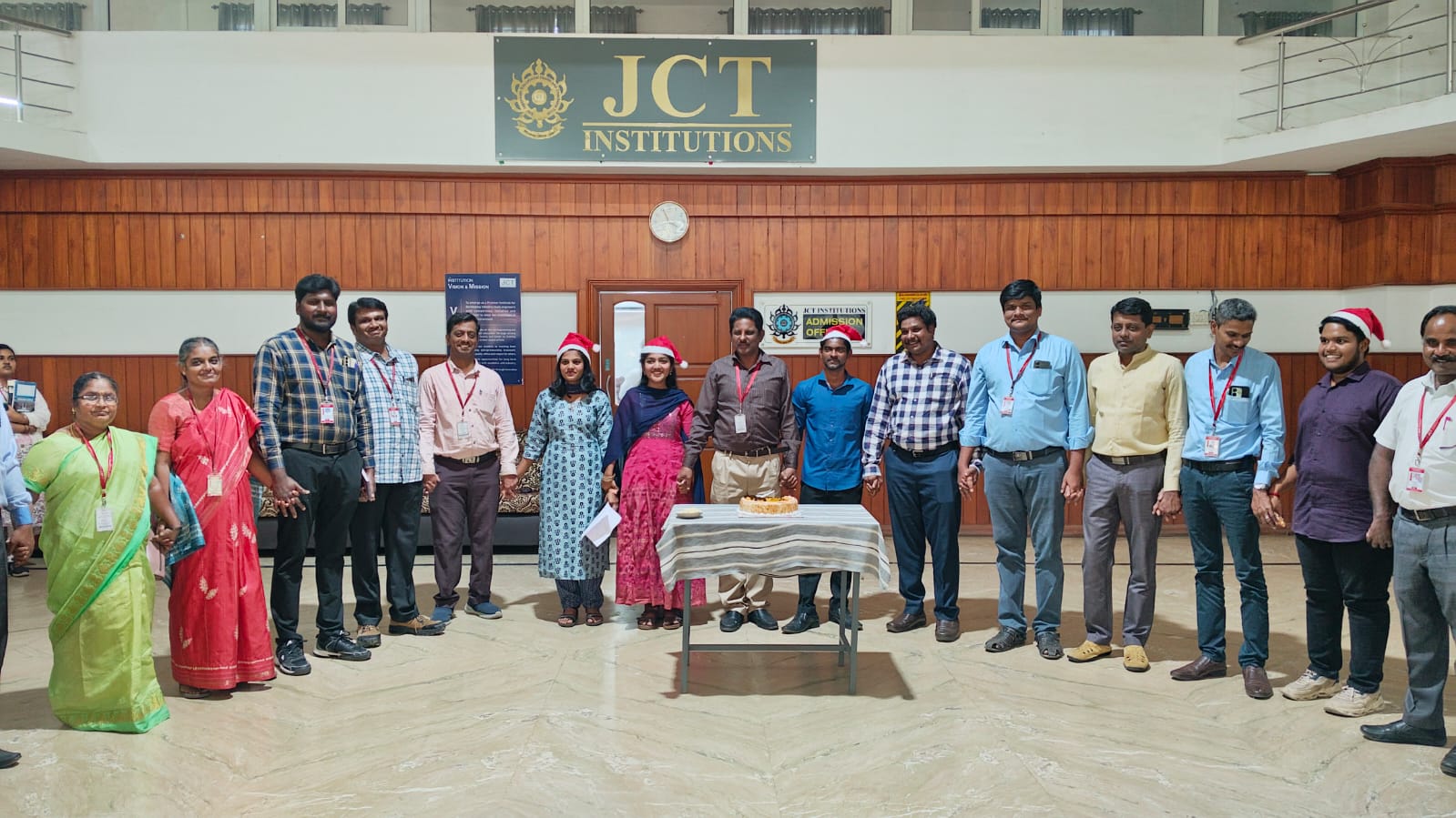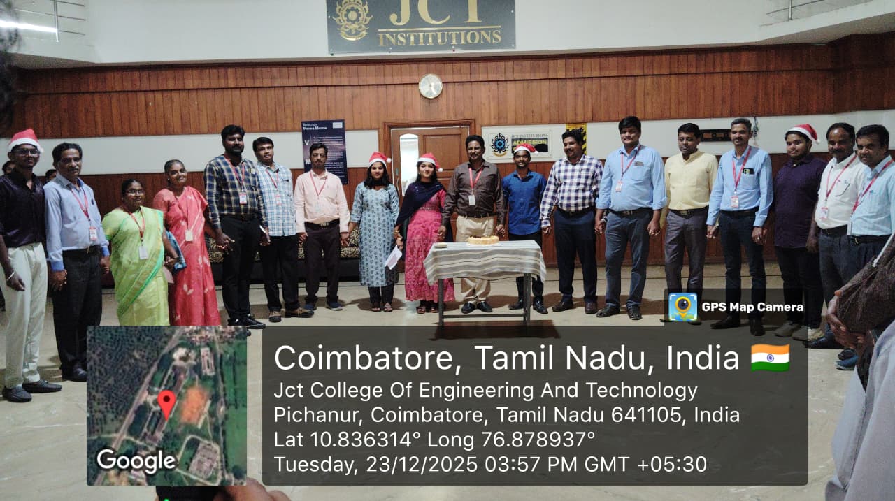 “CHRISTMAS DAY CELEBRATION” took place at JCT College of Engineering and Technology on 23.12.2025. Our Principal Dr. S. Manoharan took part in this event, sliced the cake, addressed the gathering, and mentioned that Jesus lived for others. He additionally mentioned that Jesus endured pain for others, died for them, loved even his crucifiers, and requested forgiveness on their behalf. Christmas is not only about gifts, ornaments, and festive celebrations but also about sharing love and kindness. During this time, individuals participate in charitable actions, assisting those in need and representing the genuine essence of generosity and following the example of Jesus.