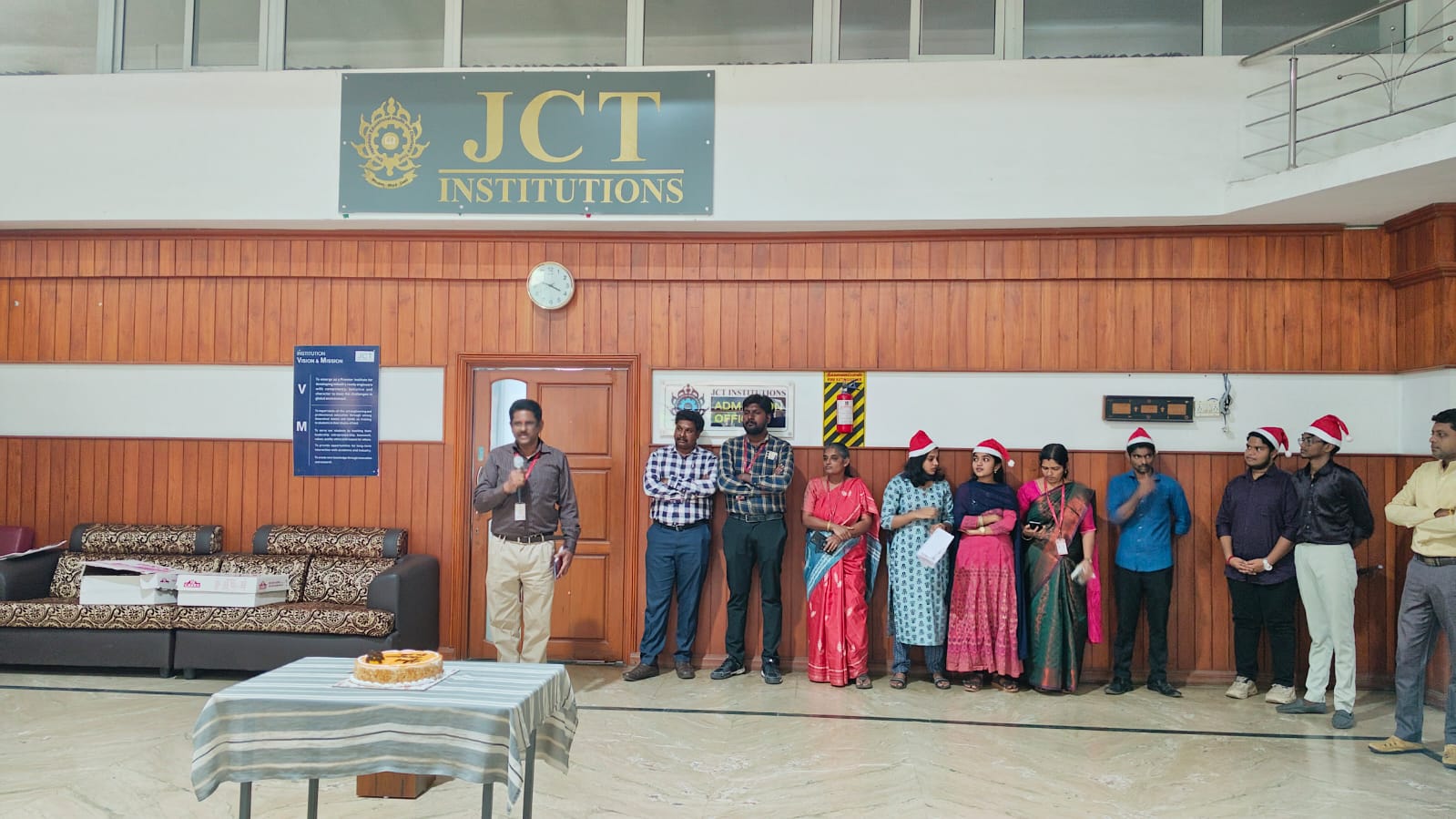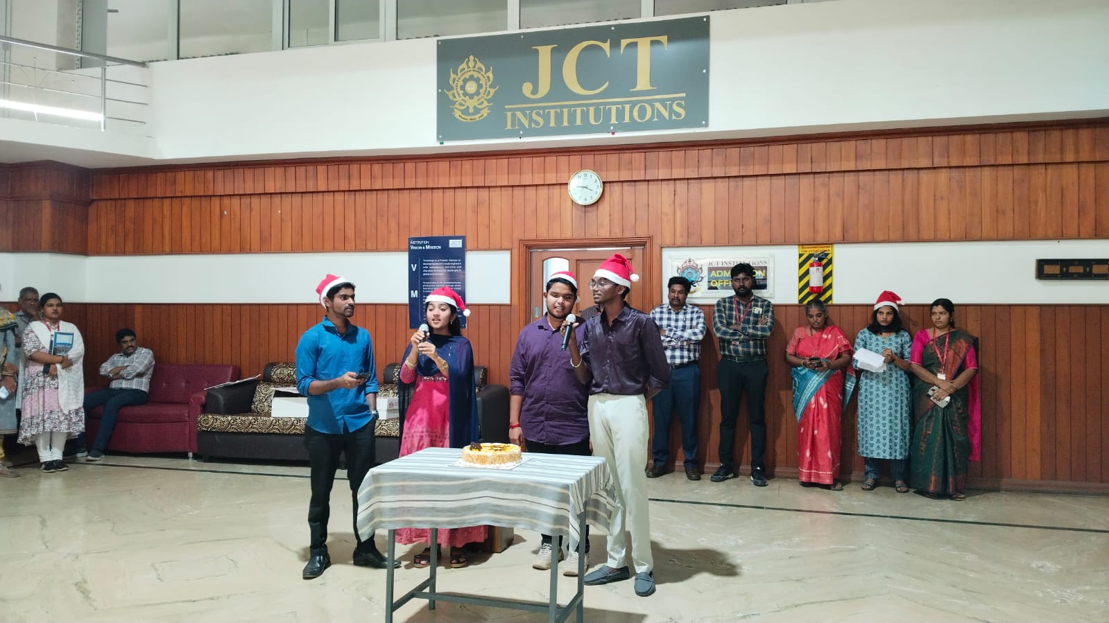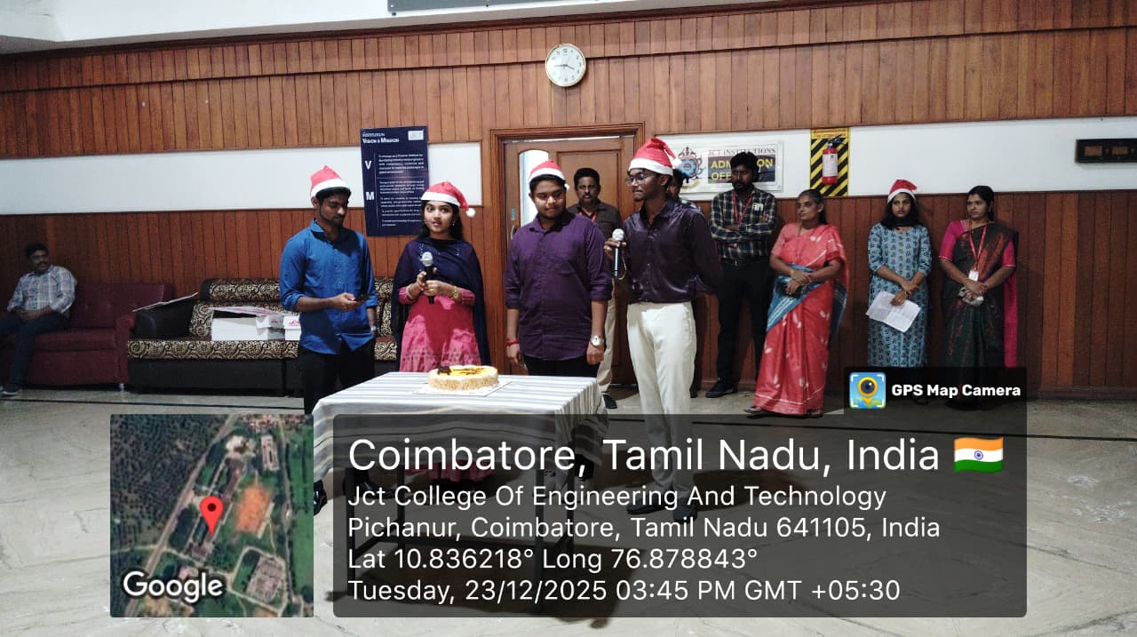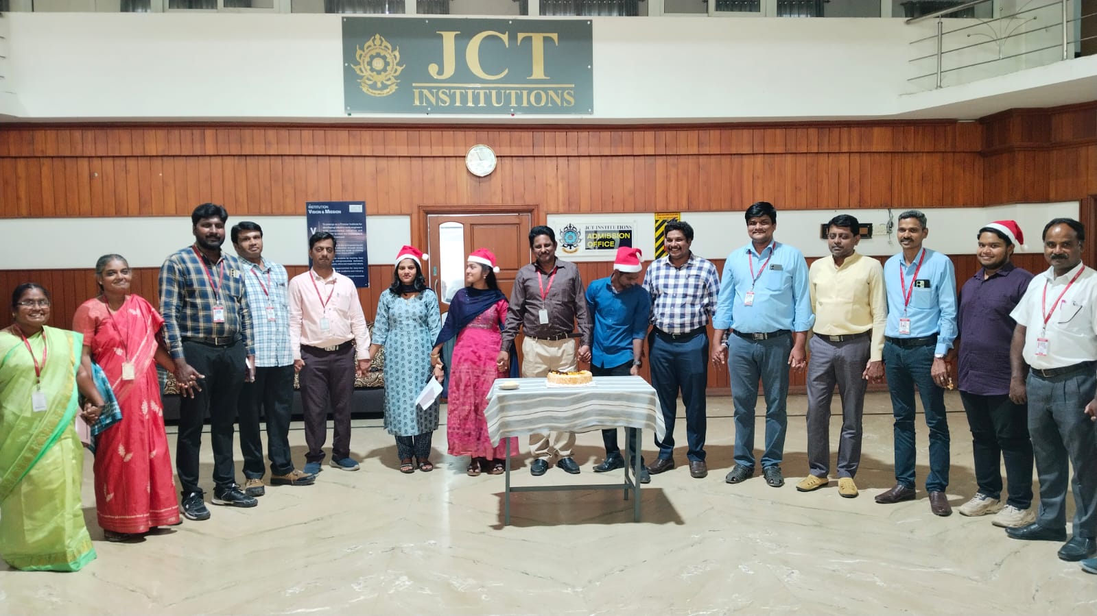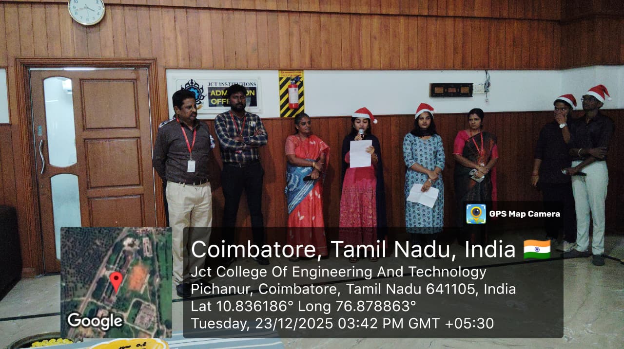 “CHRISTMAS DAY CELEBRATION” took place at JCT College of Engineering and Technology on 23.12.2025. Our Principal Dr. S. Manoharan took part in this event, sliced the cake, addressed the gathering, and mentioned that Jesus lived for others. He additionally mentioned that Jesus endured pain for others, died for them, loved even his crucifiers, and requested forgiveness on their behalf. Christmas is not only about gifts, ornaments, and festive celebrations but also about sharing love and kindness. During this time, individuals participate in charitable actions, assisting those in need and representing the genuine essence of generosity and following the example of Jesus.