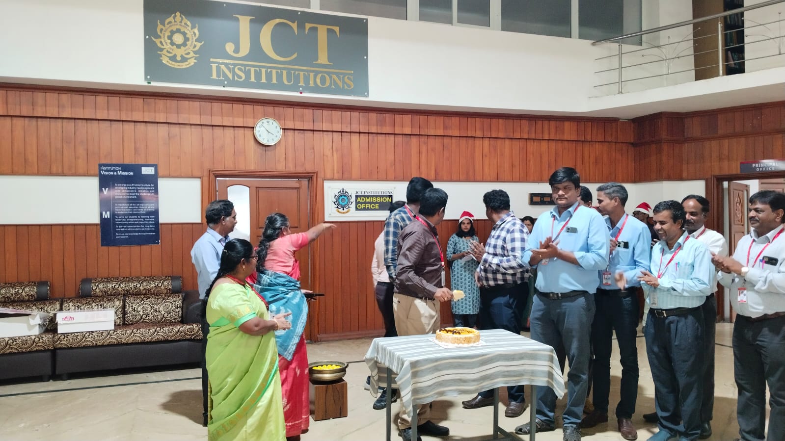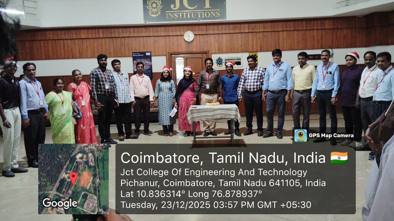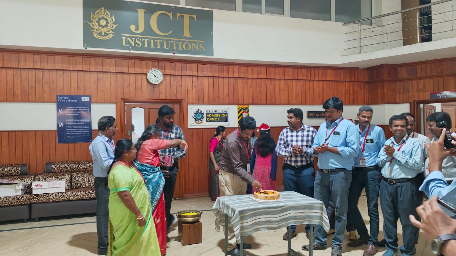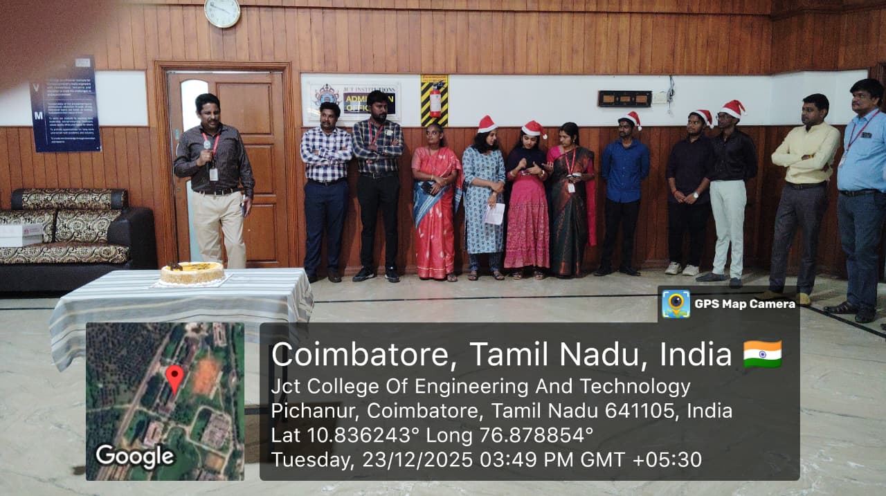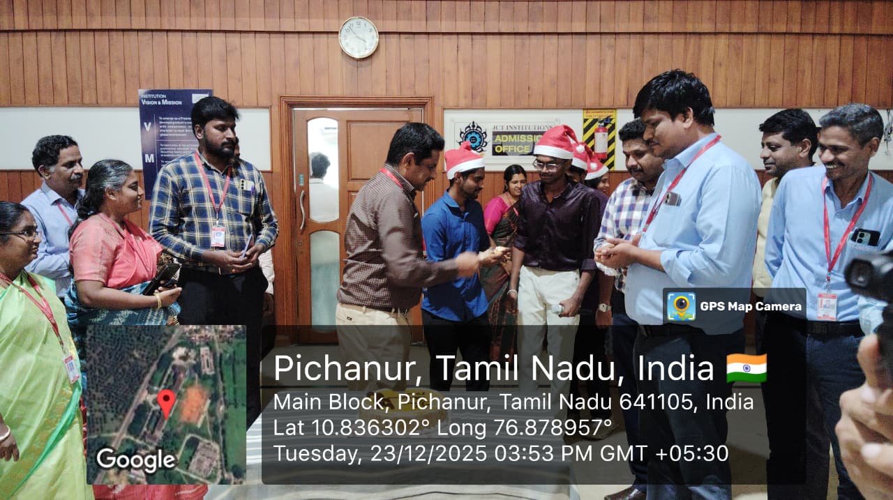 “CHRISTMAS DAY CELEBRATION” took place at JCT College of Engineering and Technology on 23.12.2025. Our Principal Dr. S. Manoharan took part in this event, sliced the cake, addressed the gathering, and mentioned that Jesus lived for others. He additionally mentioned that Jesus endured pain for others, died for them, loved even his crucifiers, and requested forgiveness on their behalf. Christmas is not only about gifts, ornaments, and festive celebrations but also about sharing love and kindness. During this time, individuals participate in charitable actions, assisting those in need and representing the genuine essence of generosity and following the example of Jesus.