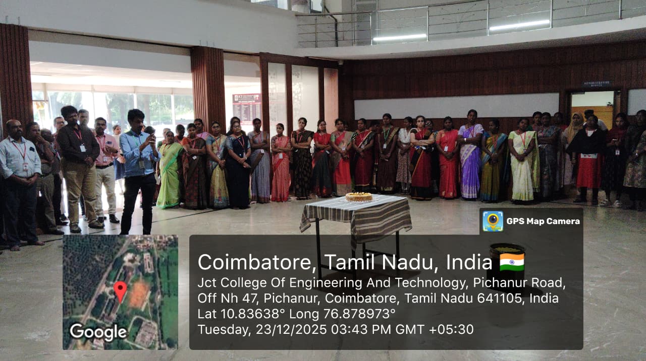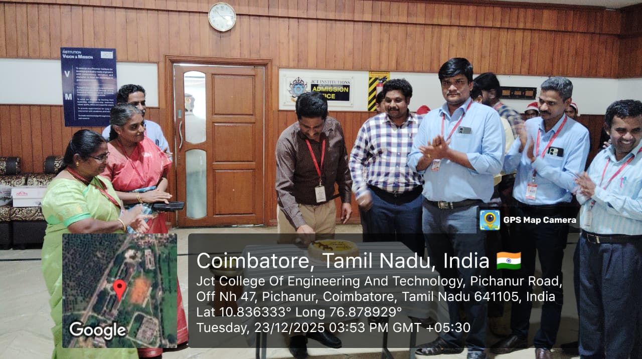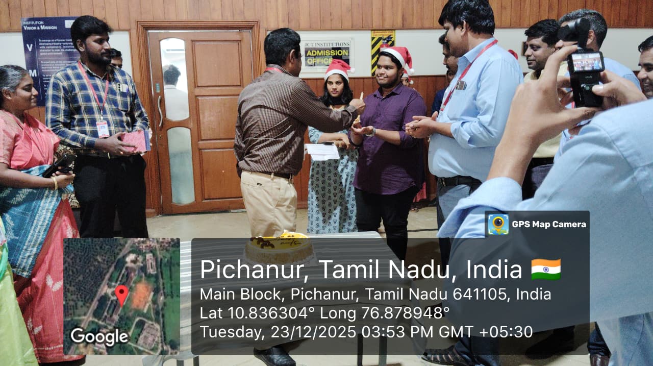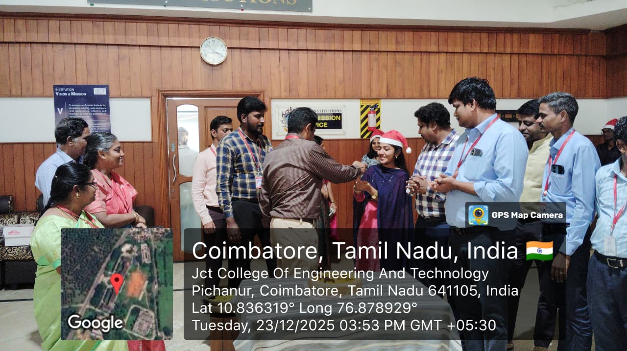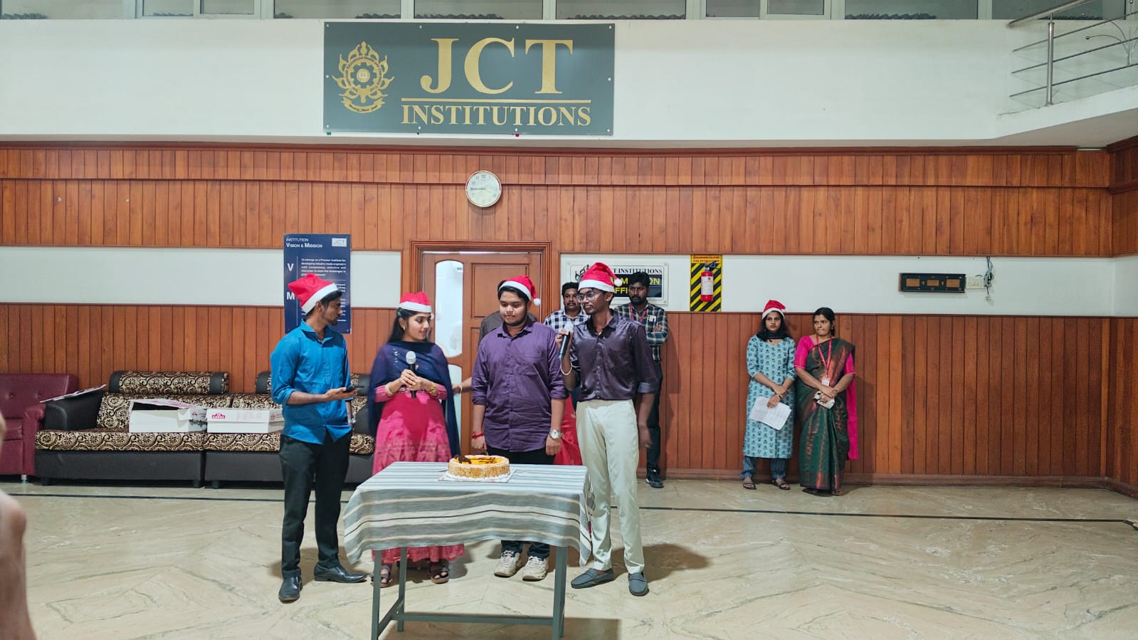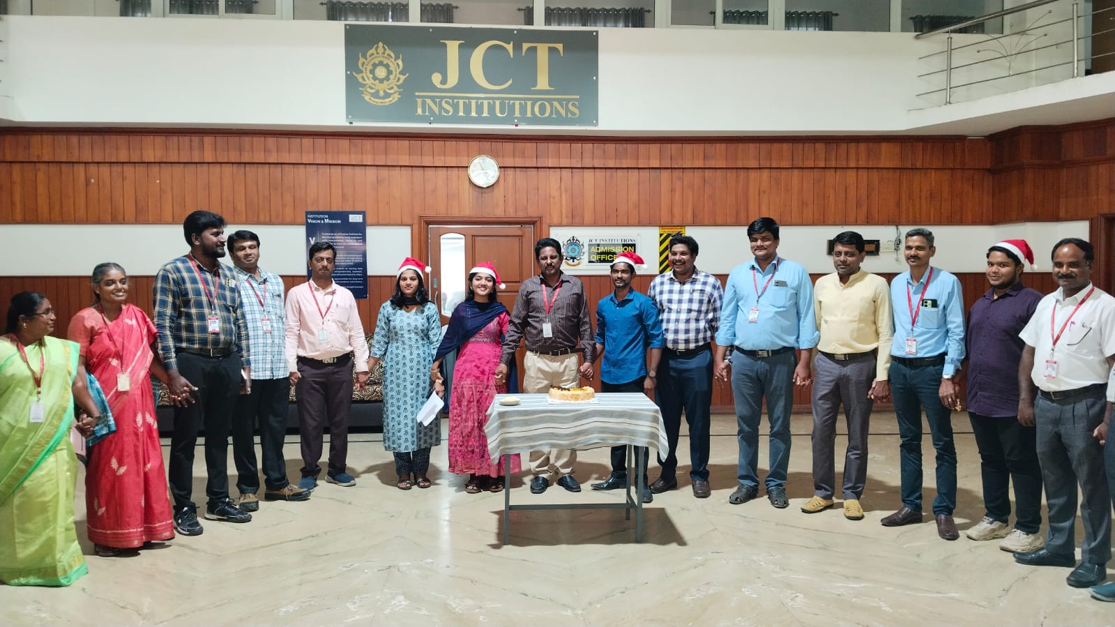 “CHRISTMAS DAY CELEBRATION” took place at JCT College of Engineering and Technology on 23.12.2025. Our Principal Dr. S. Manoharan took part in this event, sliced the cake, addressed the gathering, and mentioned that Jesus lived for others. He additionally mentioned that Jesus endured pain for others, died for them, loved even his crucifiers, and requested forgiveness on their behalf. Christmas is not only about gifts, ornaments, and festive celebrations but also about sharing love and kindness. During this time, individuals participate in charitable actions, assisting those in need and representing the genuine essence of generosity and following the example of Jesus.