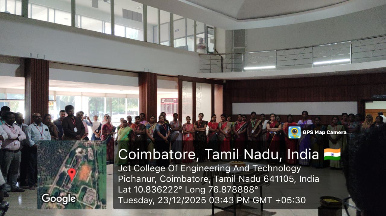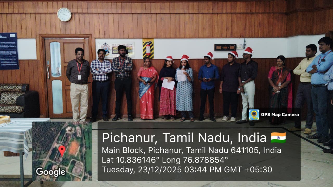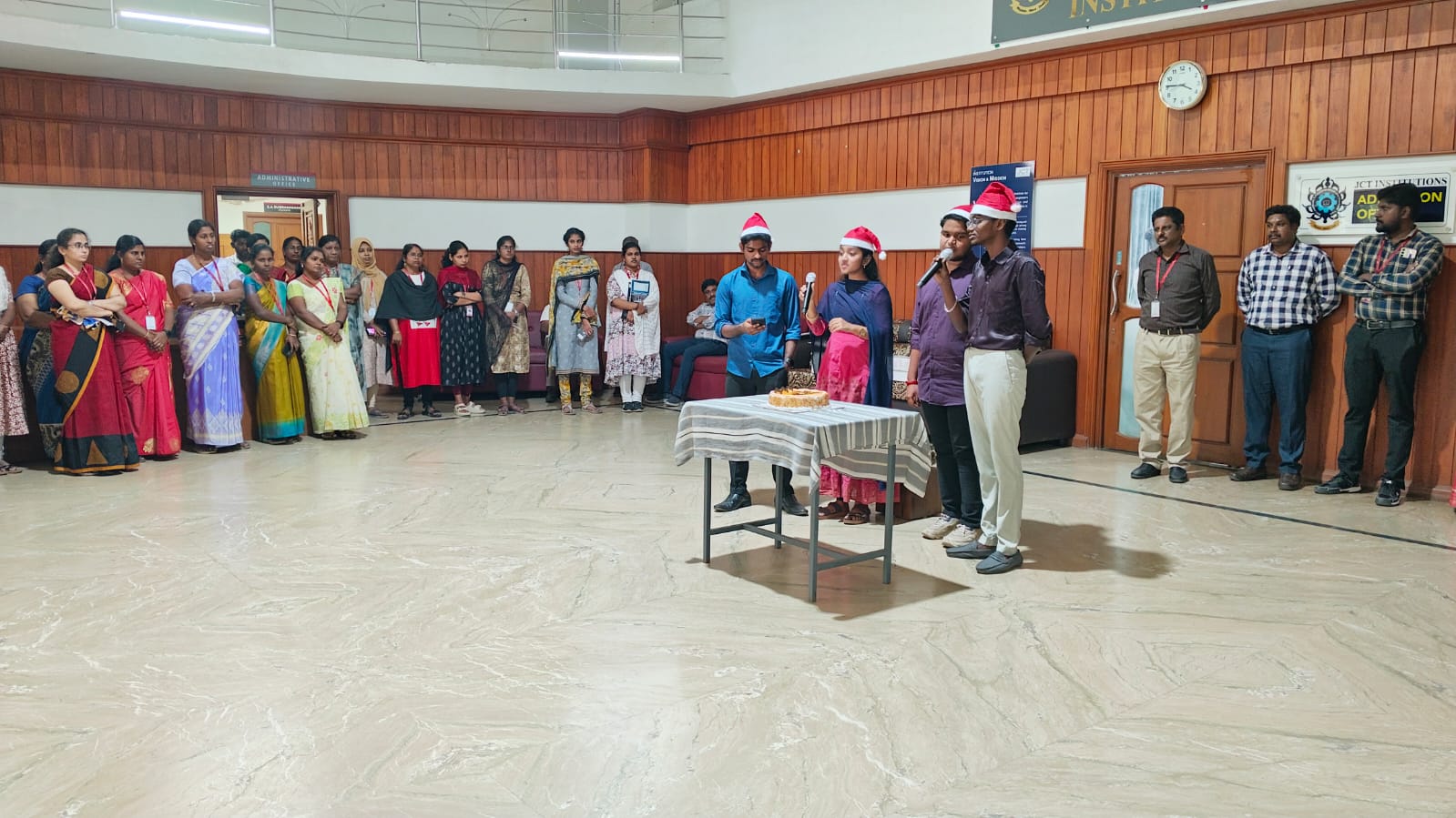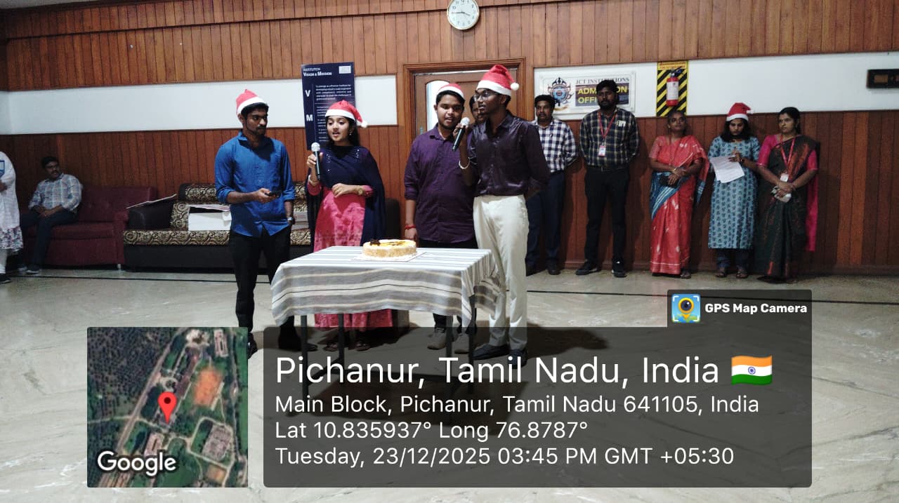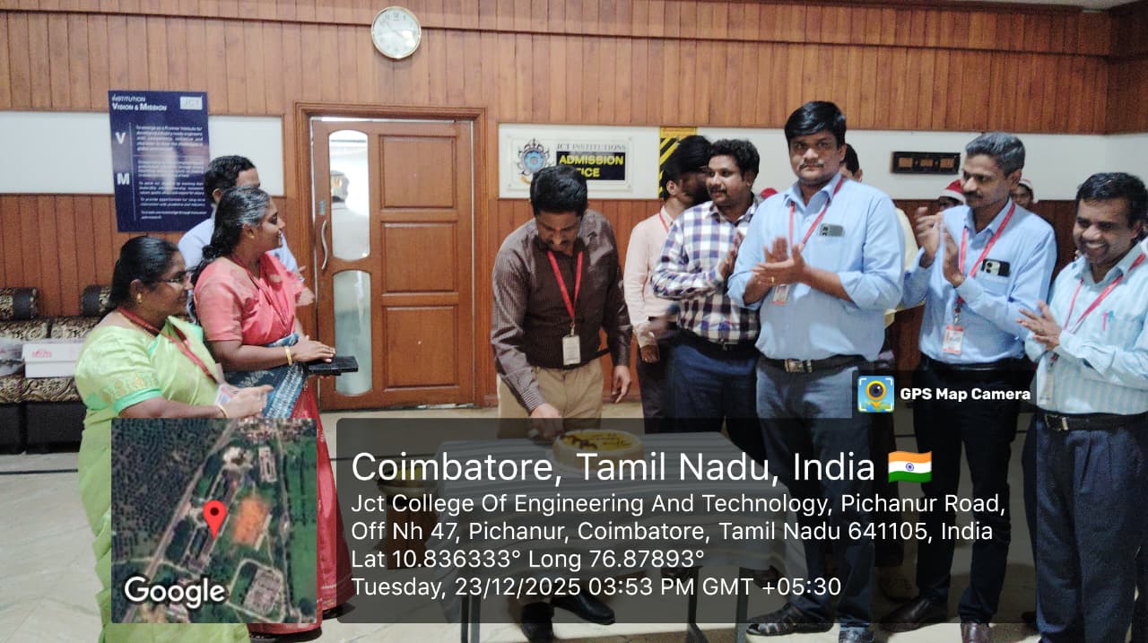 “CHRISTMAS DAY CELEBRATION” took place at JCT College of Engineering and Technology on 23.12.2025. Our Principal Dr. S. Manoharan took part in this event, sliced the cake, addressed the gathering, and mentioned that Jesus lived for others. He additionally mentioned that Jesus endured pain for others, died for them, loved even his crucifiers, and requested forgiveness on their behalf. Christmas is not only about gifts, ornaments, and festive celebrations but also about sharing love and kindness. During this time, individuals participate in charitable actions, assisting those in need and representing the genuine essence of generosity and following the example of Jesus.
