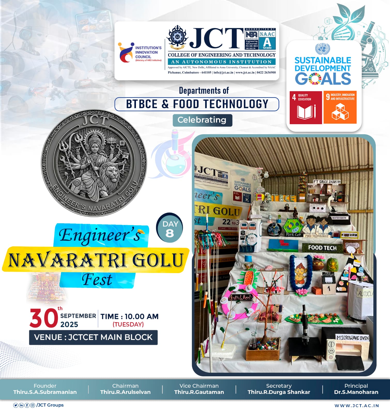 The Departments of BTBCE and Food Technology, JCT College of Engineering and Technology, organized and celebrated “Engineer’s Navaratri Golu Fest” (Day 8) on 30th September 2025 at the JCTCET Main Block. The event began at 10:00 AM and was held under the theme of integrating engineering creativity with cultural tradition.