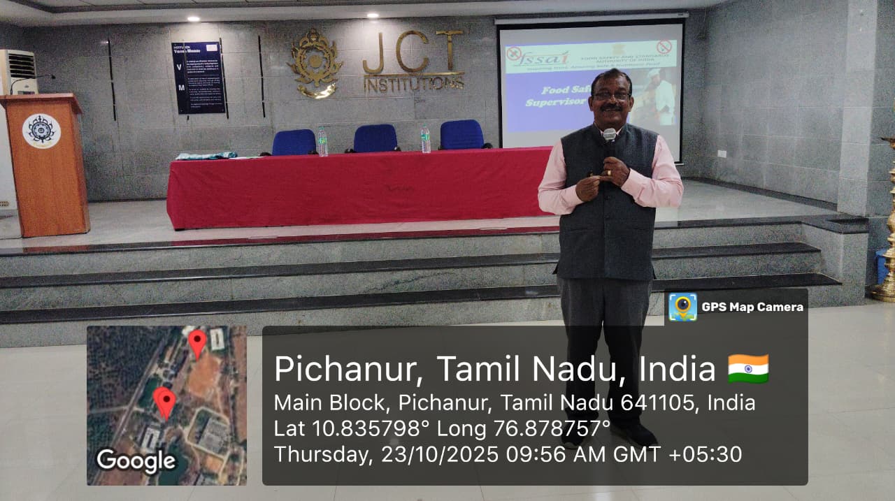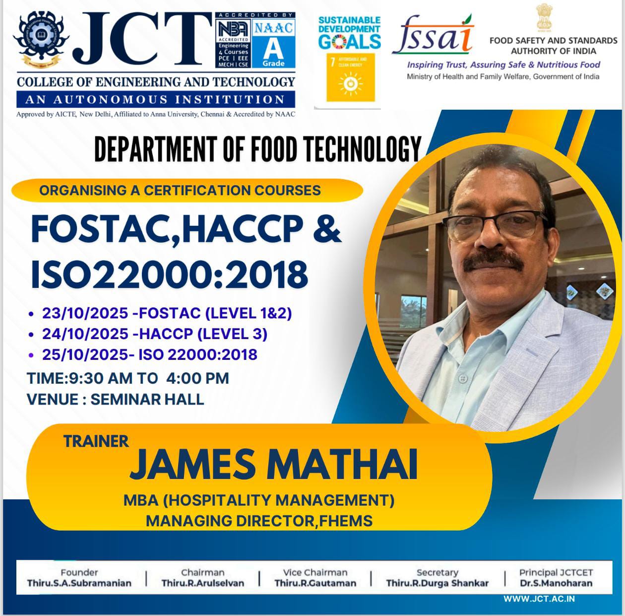 The Department of Food Technology at JCT College of Engineering and Technology successfully organized a three-day Certification Course on “FoSTaC, HACCP & ISO 22000:2018” from 23rd to 25th October 2025 at the Seminar Hall. The program aimed to enhance students’ professional competence in Food Safety Management Systems, HACCP implementation, and ISO certification standards, bridging the gap between academic learning and industrial practices.