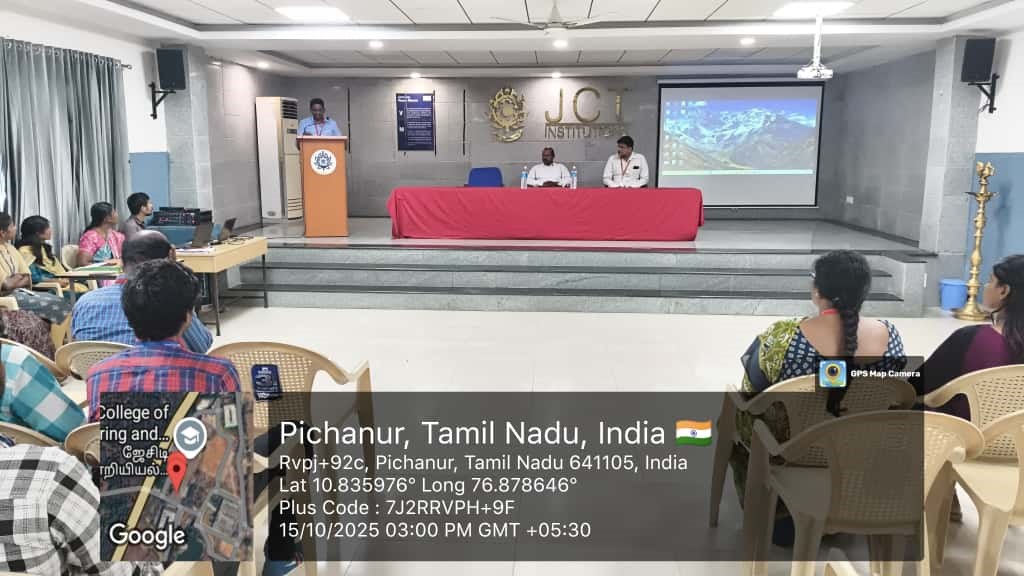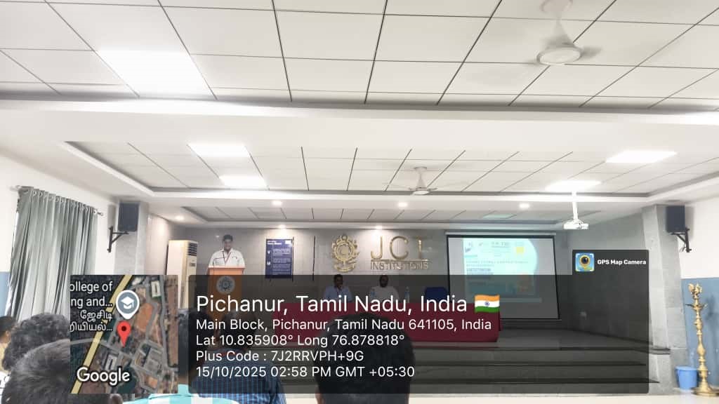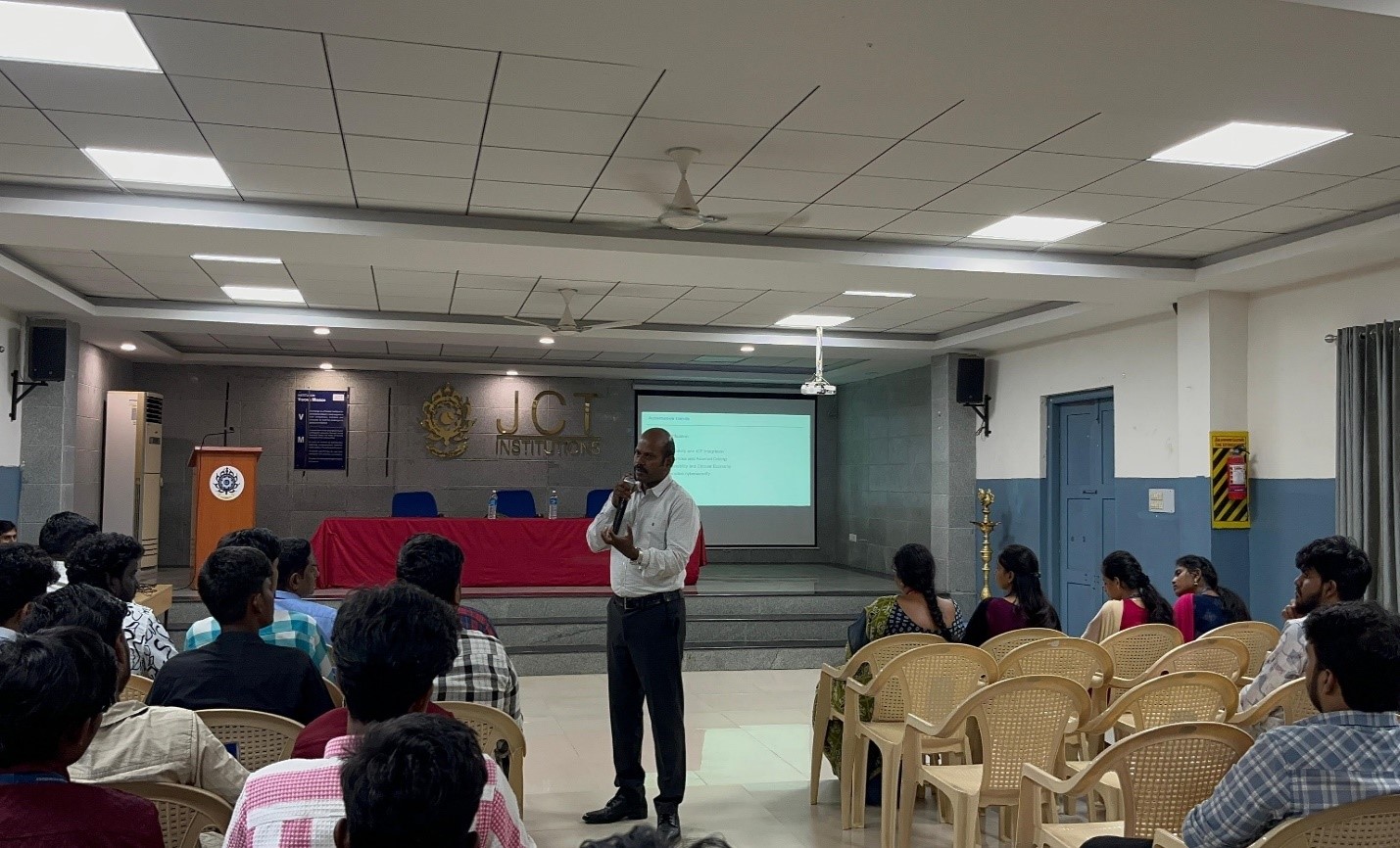 The Department of Electrical and Electronics Engineering of JCT College of Engineering and Technology organized a technical seminar on “Future EV Skill and Placement Requirements” on 15th October 2025, from 2:00 p.m. to 4:00 p.m. at the JCTCET Seminar Hall. The session was arranged under the banner of the Institution’s Innovation Council (IIC) and the IEEE Students’ Chapter, aligning with the Sustainable Development Goal – Affordable and Clean Energy.The program began with a cordial welcome address by Dr. B. Balaraj, Head of the Department of EEE, who extended his warm wishes to the invited guest, faculty members, and students. This was followed by an address by Dr. S. Manoharan, Principal of JCTCET, who highlighted the growing significance of battery technology in Electric Vehicles (EVs) and encouraged students to enhance their knowledge in this rapidly evolving field to meet industry expectations.The session was graced by the presence of Mr. K. Kathirvel, Hardware Team Manager – Power Electronics, Valeo, Chennai, as the resource person. He delivered an engaging and thought-provoking lecture on the current trends and future skill demands in the EV industry.