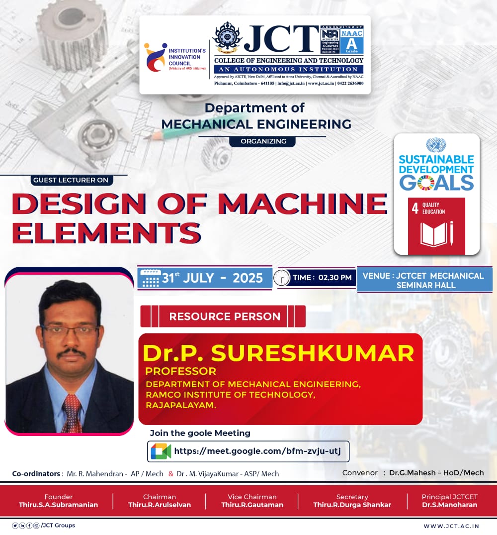 The Department of Mechanical Engineering, JCT College of Engineering and Technology, Coimbatore organized a Guest Lecture entitled “DESIGN OF MACHINE ELEMENTS” on 31.07.2025 for imparting fundamental knowledge of Design attributes in Mechanical Industries.Dr.G.Mahesh,Professor & Head, Department of Mechanical Engineering delivered the welcome address and Mr.R.Mahendran,AP/Mech invited the Chief Guest. The resource person explained by understanding the importance and significance of designing machine elements, engineers can create innovative, efficient and reliable machines that meet the needs of industries and societies He also explained that the Design of Machine Elements drives technological advancements, enabling the development of new materials, manufacturing processes and innovative products, A well-designed machine element ensures consistent product quality, reducing defects and improving customer satisfaction as well. Also efficient Design of Machine Elements can lead to reduced energy consumption, lower emissions and minimized environmental impact. Totally, more than 75 students and faculty members attended the programme. Dr.M. Vijayakumar, ASP/Mech proposed the vote of thanks.