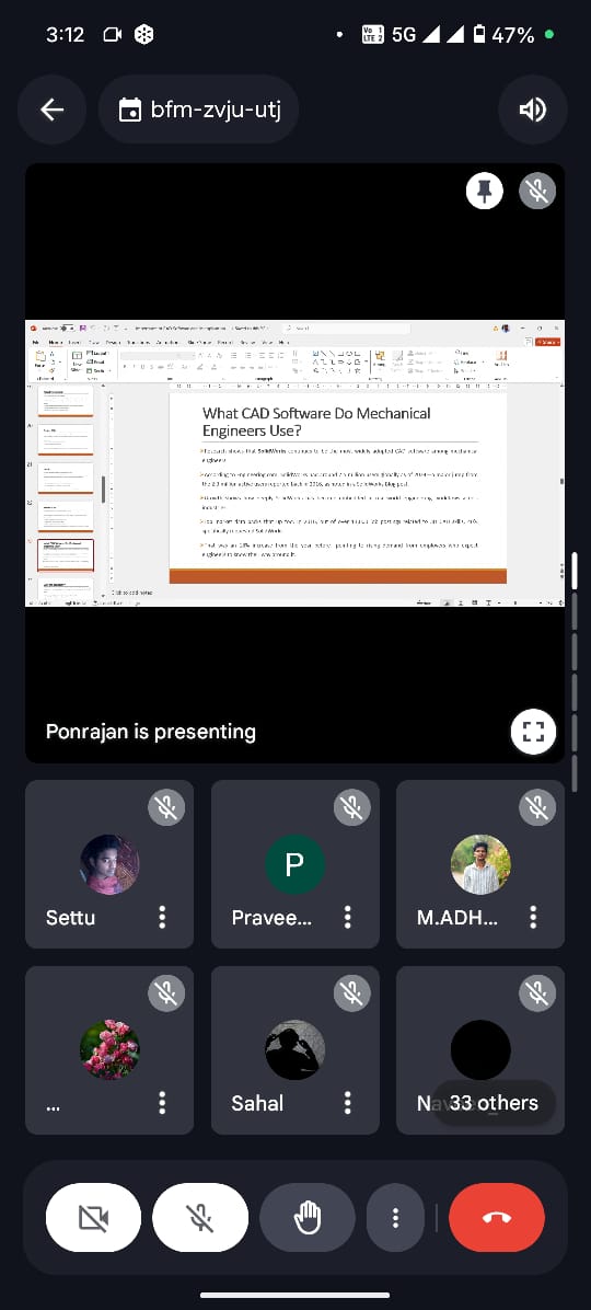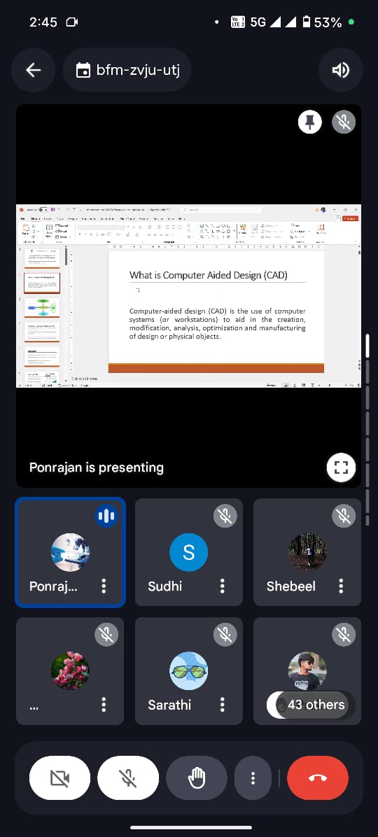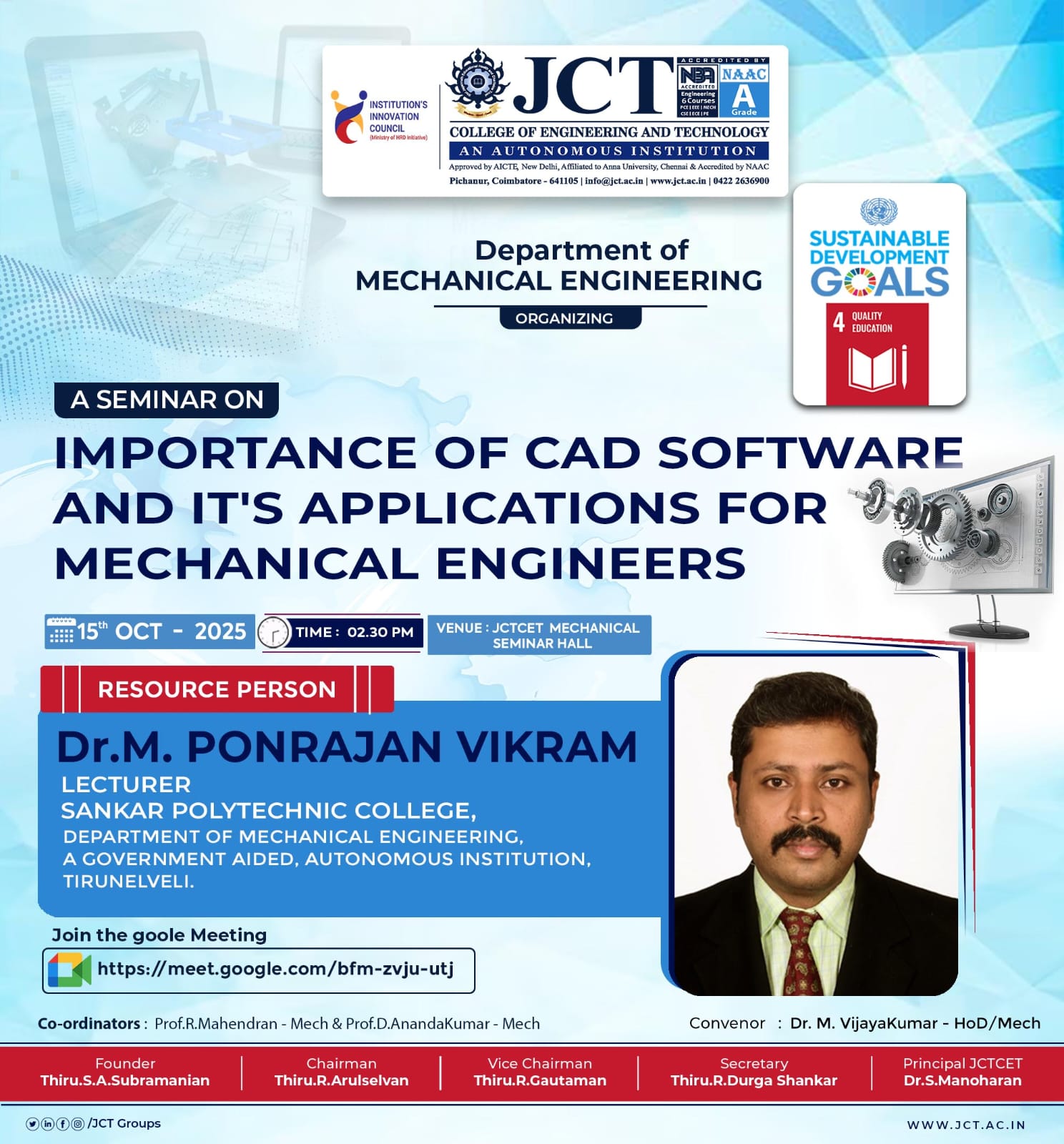 The Department of Mechanical Engineering, JCT College of Engineering and Technology, Coimbatore organized a Seminar entitled “IMPORTANCE OF CAD SOFTWARE AND IT’s APPLICATIONS FOR MECHANICAL ENGINEERS” on 15.10.2025 for imparting fundamental knowledge of CAD Software in Mechanical Industries. Dr.M.VijayaKumar, Associate Professor, Department of Mechanical Engineering delivered the welcome address and Mr.R.Mahendran,AP/Mech invited the Chief Guest. The resource person explained the importance and significance of CAD Software in Mechanical Industries. He also explained that CAD software allows for the creation of highly accurate 2D and 3D models with exact dimensions, which is essential for preventing errors in final products. Also CAD facilitates seamless teamwork by enabling easy sharing of digital models and data among team members, suppliers and manufacturers, regardless of location. Engineers can use CAD to optimize designs for energy efficiency and reduced material consumption, contributing to more sustainable products Totally, more than 75 students and faculty members attended the programme. Mr.D.AnandaKumar, AP/Mech proposed the vote of thanks.