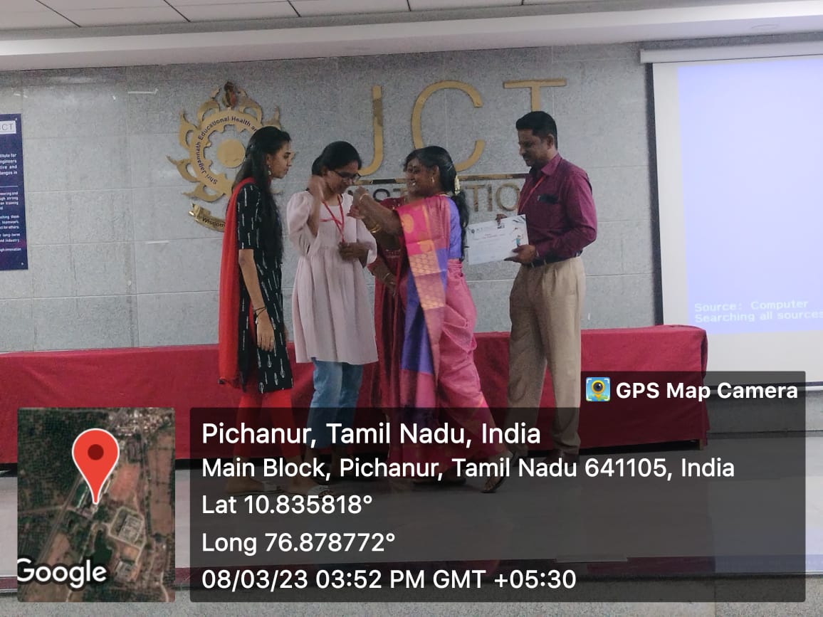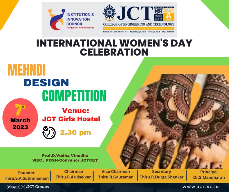 “INTERNATIONAL WOMEN’S DAY CELEBRATION” was organized on 08.03.2023 by the Women Empowerment & Prevention of Sexual Harassment (PoSH) Cell at JCT college of Engineering and Technology, Coimbatore. The celebration started at 10.00 am by lighting the Kuthuvilakku. All the Heads of various Departments, Faculty members and girl students from various departments attended the programme.