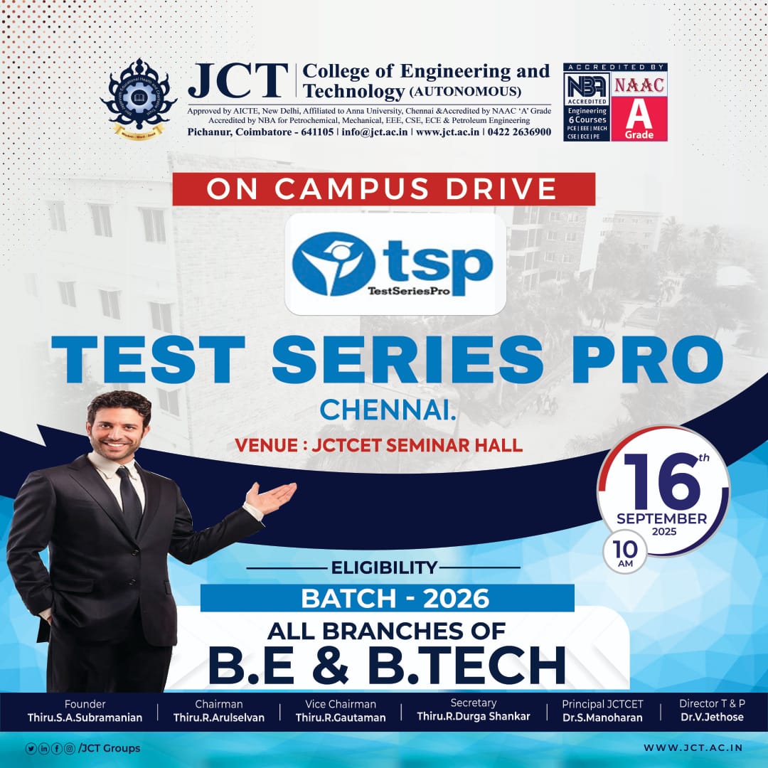 The Training and Placement Cell of JCT College of Engineering and Technology organized an On-Campus Recruitment Drive on 16.09.2025 in collaboration with Test Series Pro, an innovative EdTech platform providing high-quality test preparation solutions across competitive exams such as Engineering, Medical, Railways, Banking, and more. With partnerships spanning colleges, corporates, and affiliate networks, Test Series Pro empowers students and professionals with cutting-edge test series, learning tools, and result-oriented preparation strategies. Final-year students from the Departments of Artificial Intelligence and Data Science, Computer Science and Engineering, Computer Science and Business Systems, and Electronics and Communication Engineering participated in the drive. The recruitment team, including the CEO and HR executives of Test Series Pro, visited the campus to conduct the selection process.