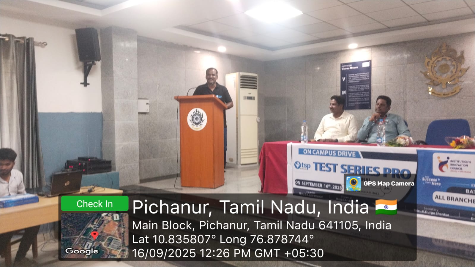 The program began with a welcome address by Dr.S.Manoharan, Principal of JCT College of Engineering and Technology, followed by a pre-placement talk delivered by the CEO of Test Series Pro. The HR and Talent Acquisition team then provided details about the nature of work, job roles, workplace culture, career prospects, work locations, and the stages of the interview process.