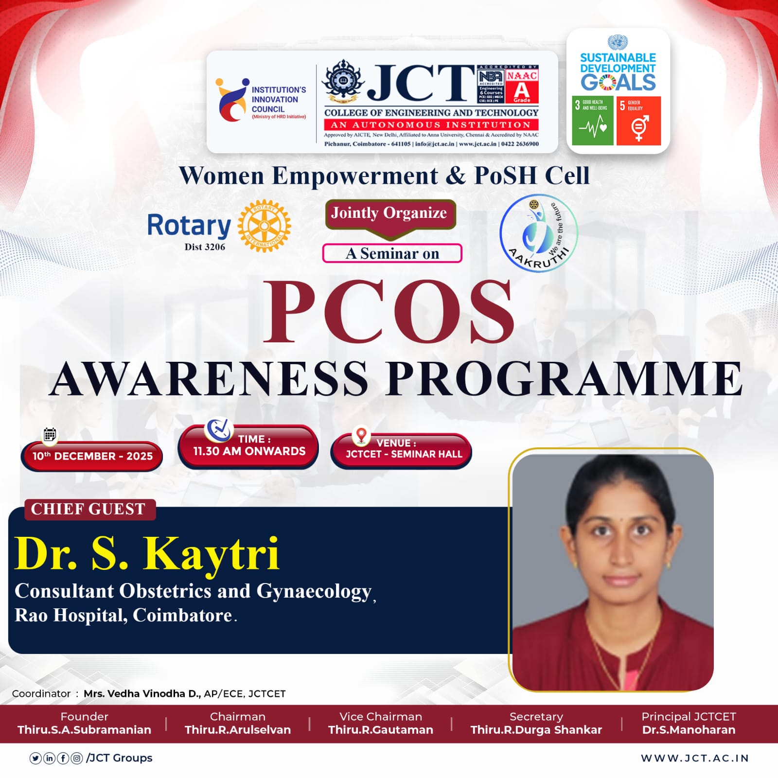 Engineering and Technology organized an enlightening awareness program on Polycystic Ovary Syndrome (PCOS). The session was held at the Seminar Hall and brought together girl students and women cell coordinators from various departments. The program commenced with a warm welcome that set the tone for an informative and engaging session on women’s health and wellbeing.