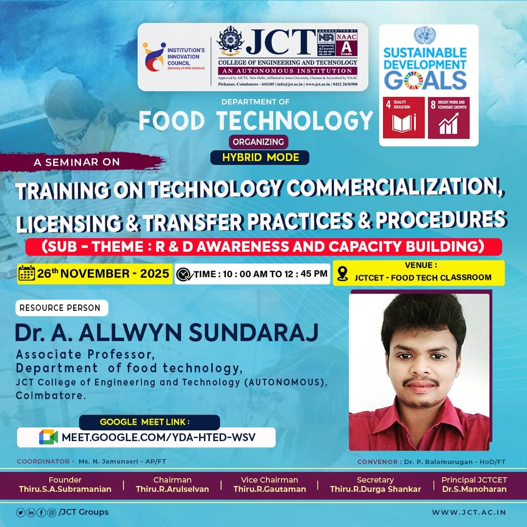 The Department of Food Technology at JCT College of Engineering and Technology organized a seminar on 26th November 2025 titled “Training on Technology Commercialization, Licensing & Transfer Practices & Procedures” under the IIC Sub-Theme: R&D Awareness and Capacity Building. The program aimed to enhance students’ understanding of the processes involved in converting research outcomes into commercially viable technologies, in alignment with Sustainable Development Goal 9: Industry, Innovation, and Infrastructure.
