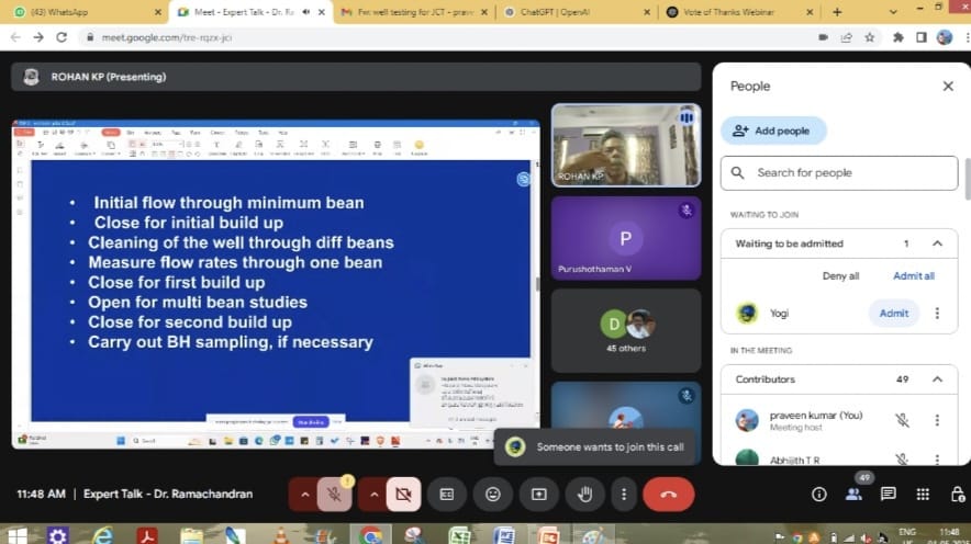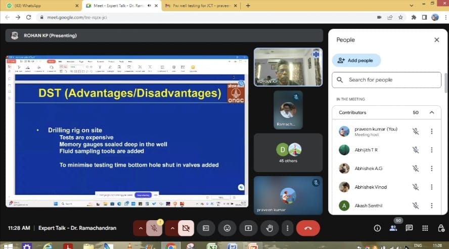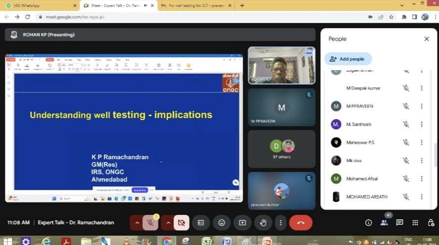 Mr. Ramachandran, with his vast experience in petroleum exploration and production, delivered an enlightening talk on “Understanding Well Testing – Implications.” He delved into the critical aspects of well testing, emphasizing its significance in evaluating reservoir performance, optimizing production, and ensuring the economic viability of oil and gas projects. His comprehensive explanation covered the key methodologies used in well testing, including pressure transient analysis, production testing, and drill stem testing. The session also highlighted the interpretation of well test data to assess reservoir properties, detect formation damages, and make informed decisions on field development.