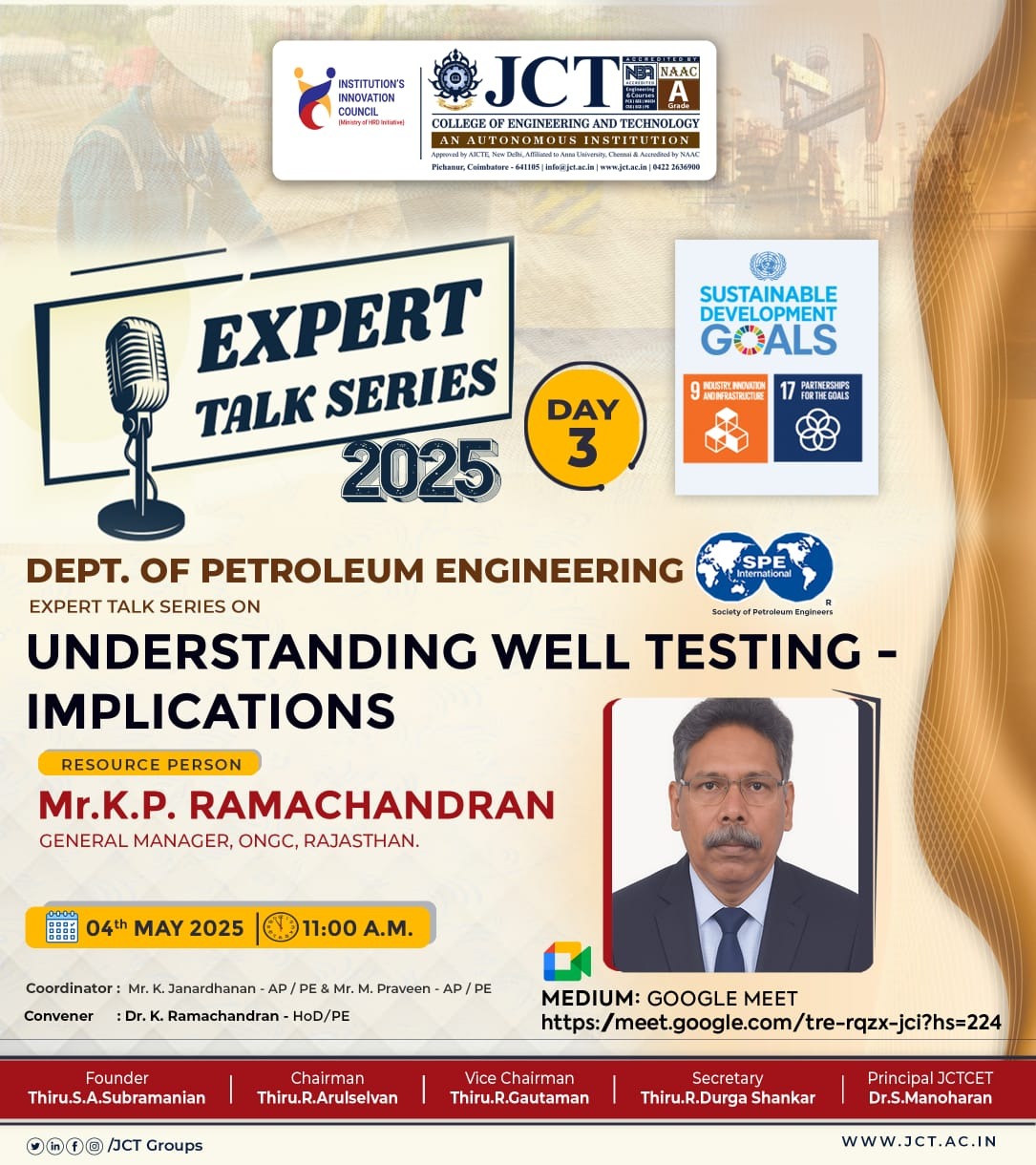 On 4th May 2025, the Department of Petroleum Engineering successfully conducted Day 3 of the Expert Talk Series, a signature initiative aimed at providing students with insights into cutting-edge technologies and industry practices. The session, held under the theme of Sustainable Development Goals (SDGs) with a focus on Industry, Innovation, and Infrastructure (Goal 9) and Partnerships for the Goals (Goal 17), featured a distinguished expert, Mr. K.P. Ramachandran, General Manager, ONGC, Rajasthan.