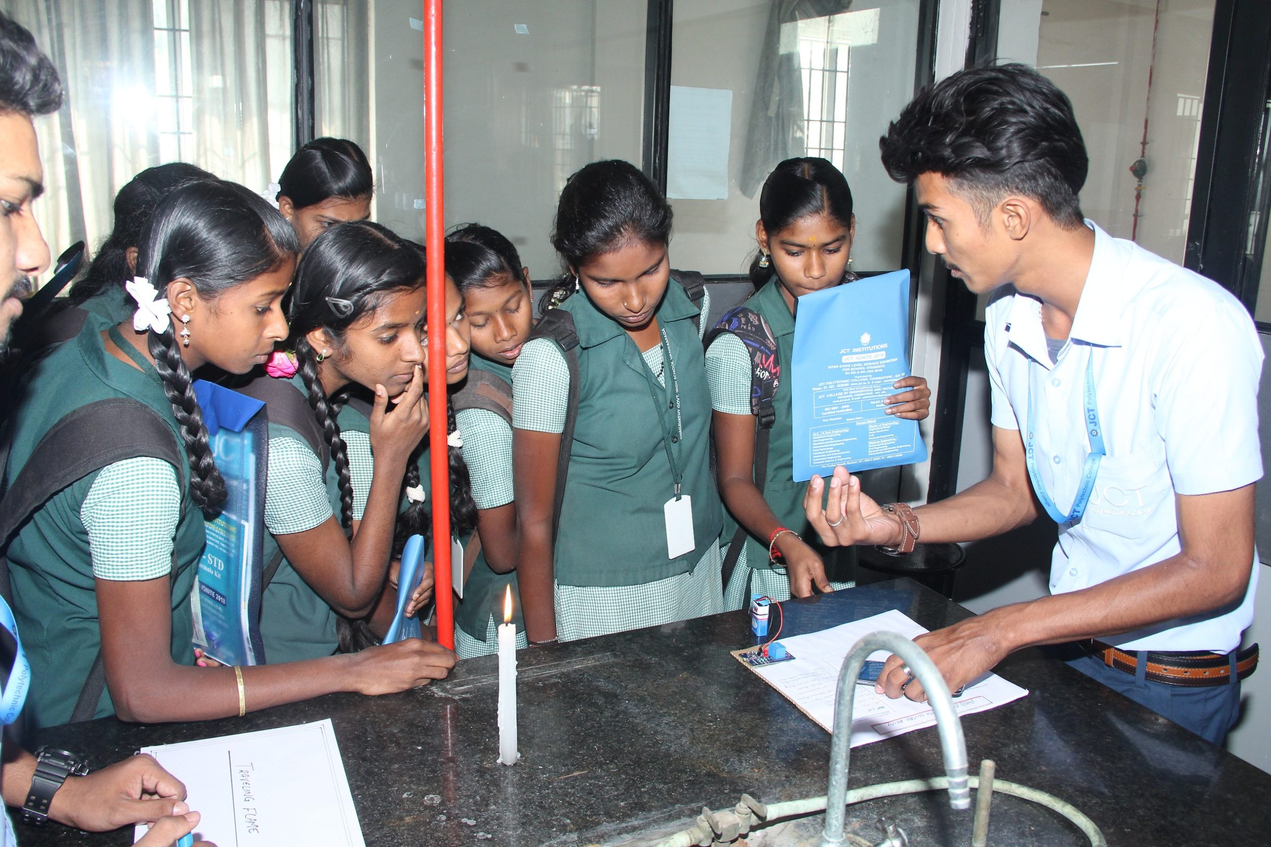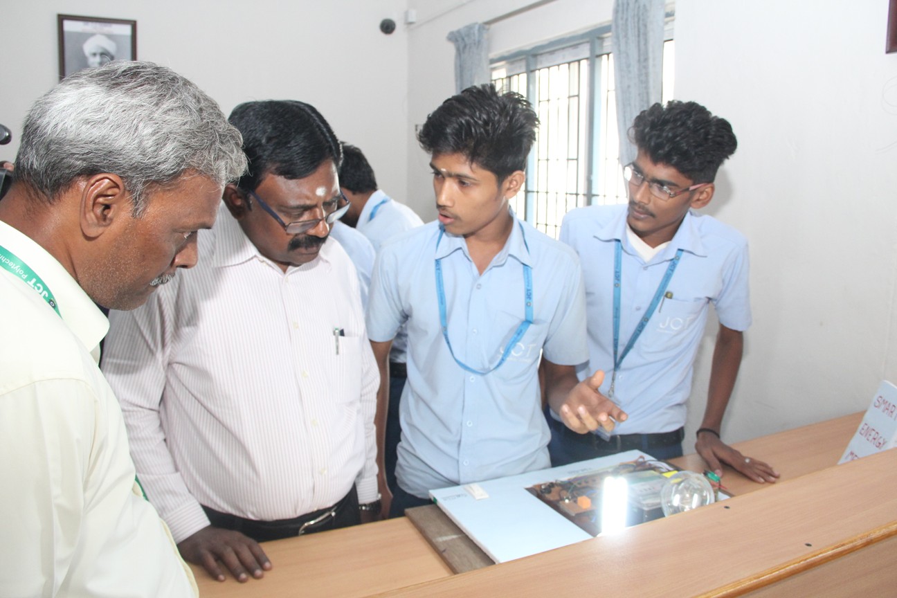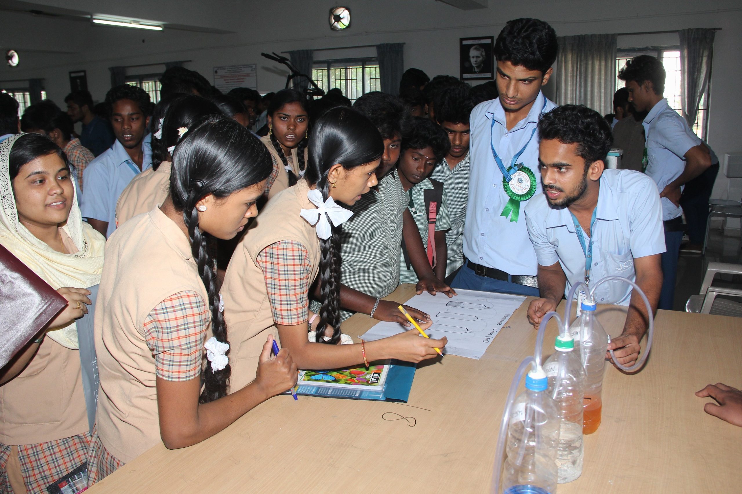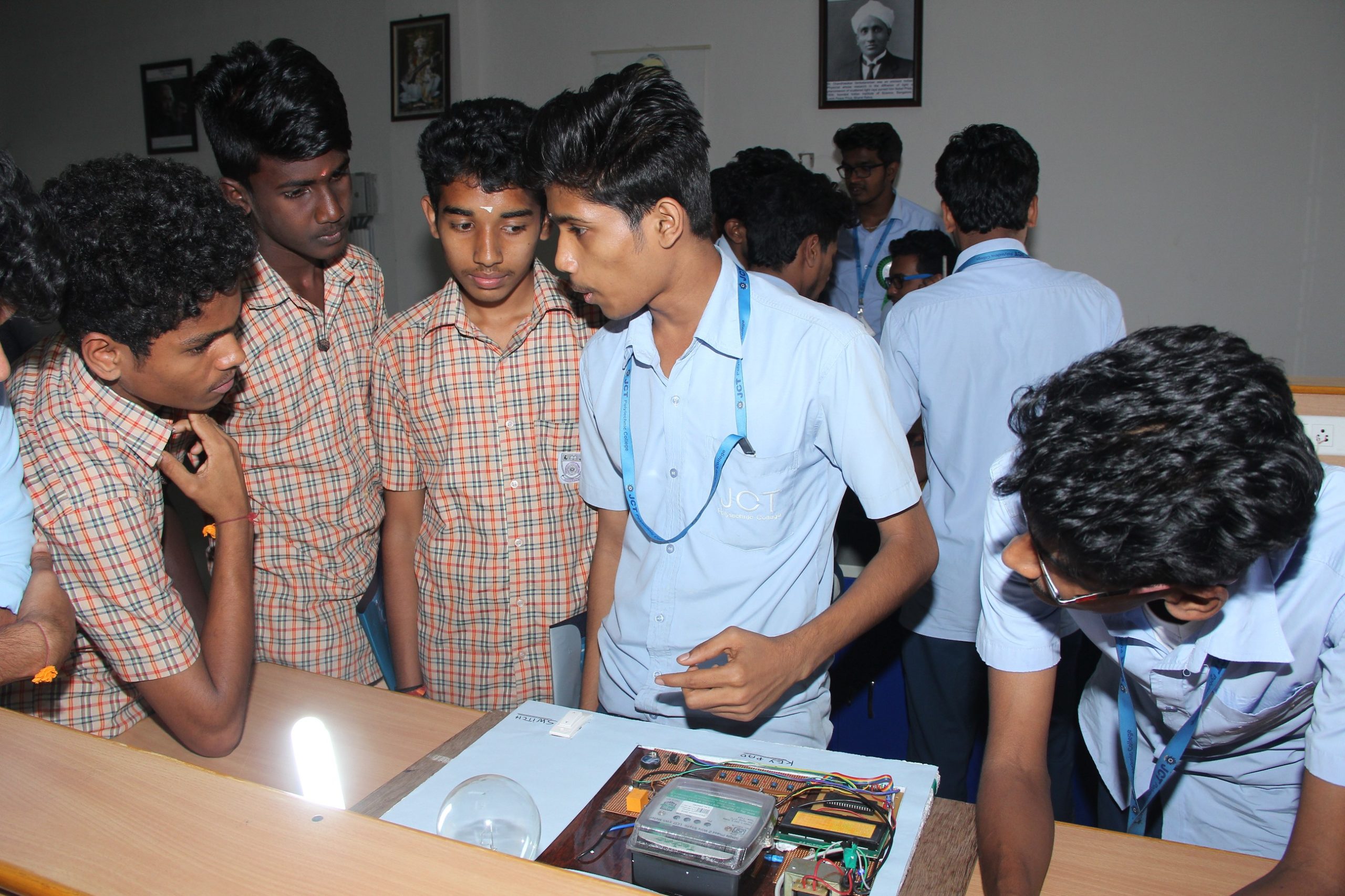 A total of 58 projects from Polytechnic students and 18 projects from School students were exhibited in Physics and Chemistry Labs of JCT CET. During the first day 468 students and the second day 205 students were participated from various schools. About 50 students from engineering college were also visited. A study kit which includes a file, pen, formula kit (10th and 12th std), Pocket 2018 Calendar with Public Exam Timetable, college broucher and exhibition broucher were distributed to all the participants along with refreshments. The accompanying teachers of respective schools were also honored with our Institution diary and Calendar. About 100 volunteers were also involved. To and from transport were arranged to all the school participants. Some of the accepted schools were unable to participate due to their last minute problems.