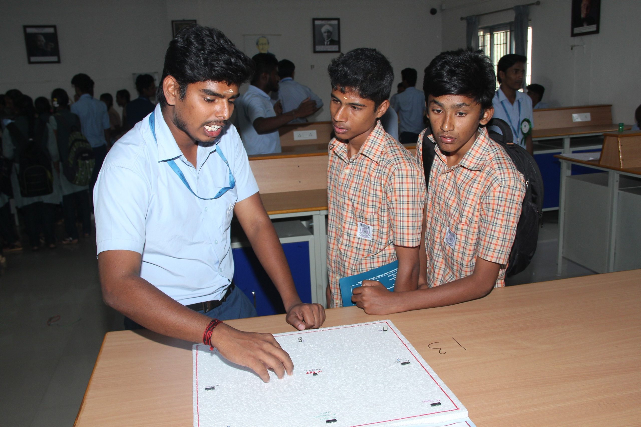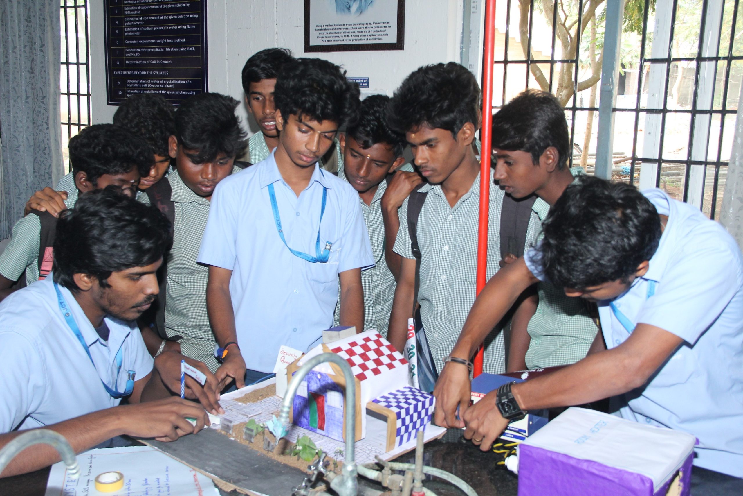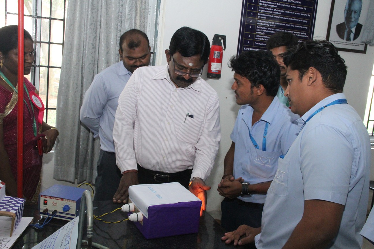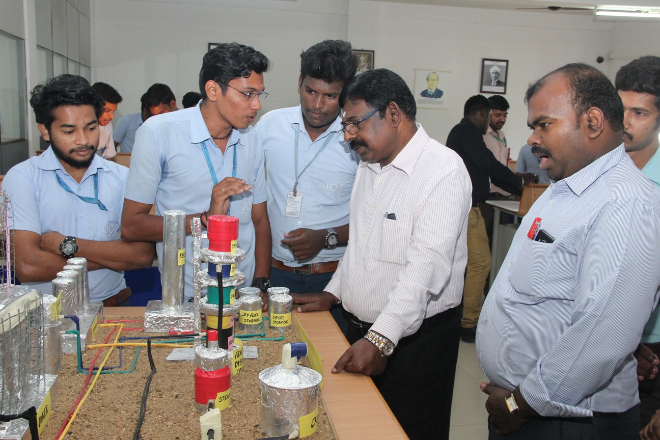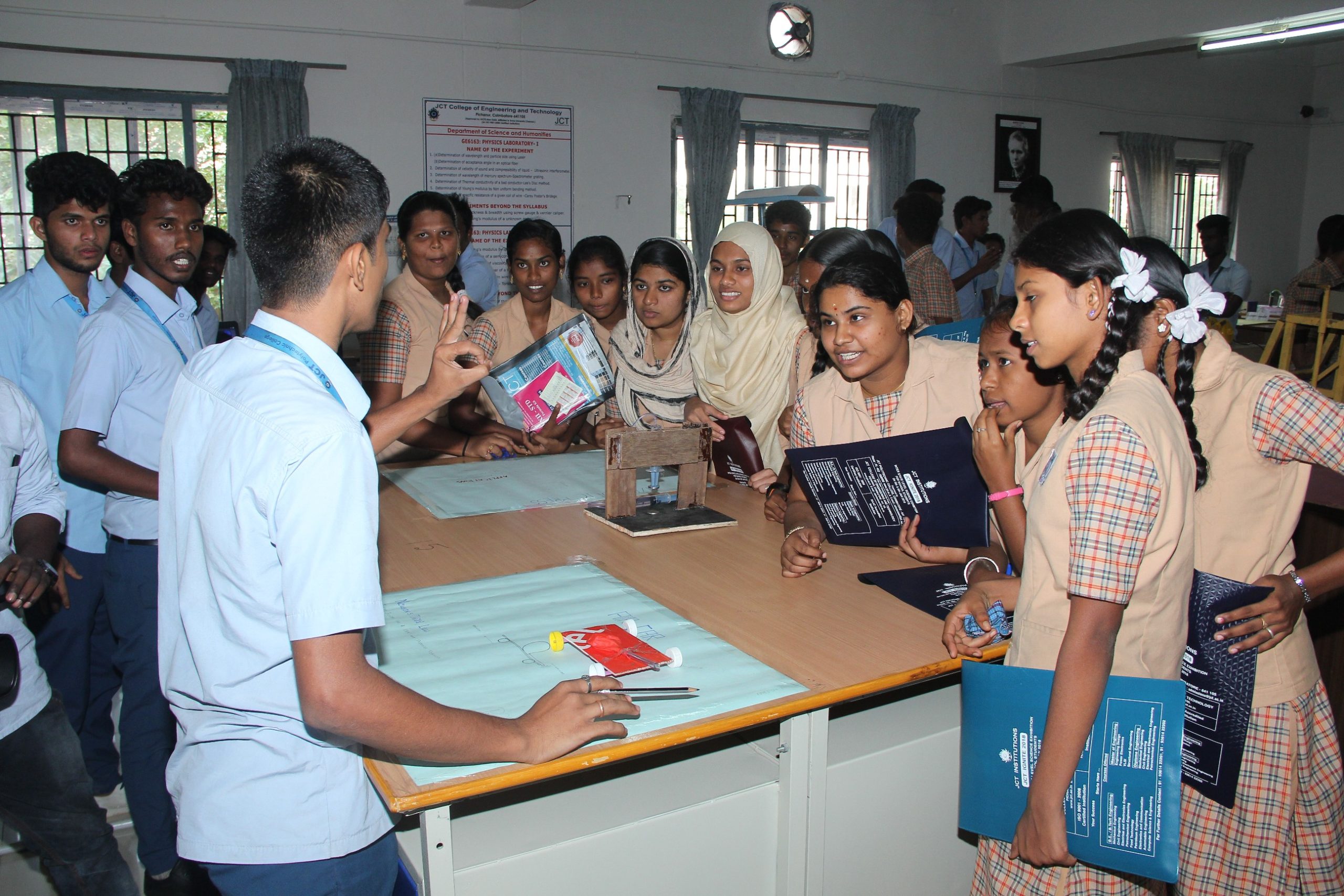 A total of 58 projects from Polytechnic students and 18 projects from School students were exhibited in Physics and Chemistry Labs of JCT CET. During the first day 468 students and the second day 205 students were participated from various schools. About 50 students from engineering college were also visited. A study kit which includes a file, pen, formula kit (10th and 12th std), Pocket 2018 Calendar with Public Exam Timetable, college broucher and exhibition broucher were distributed to all the participants along with refreshments. The accompanying teachers of respective schools were also honored with our Institution diary and Calendar. About 100 volunteers were also involved. To and from transport were arranged to all the school participants. Some of the accepted schools were unable to participate due to their last minute problems.