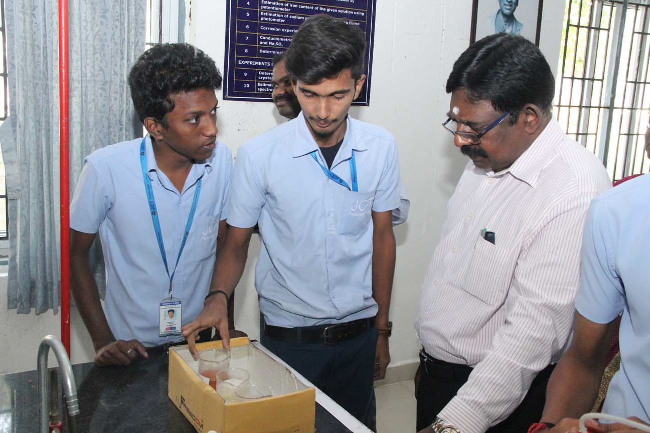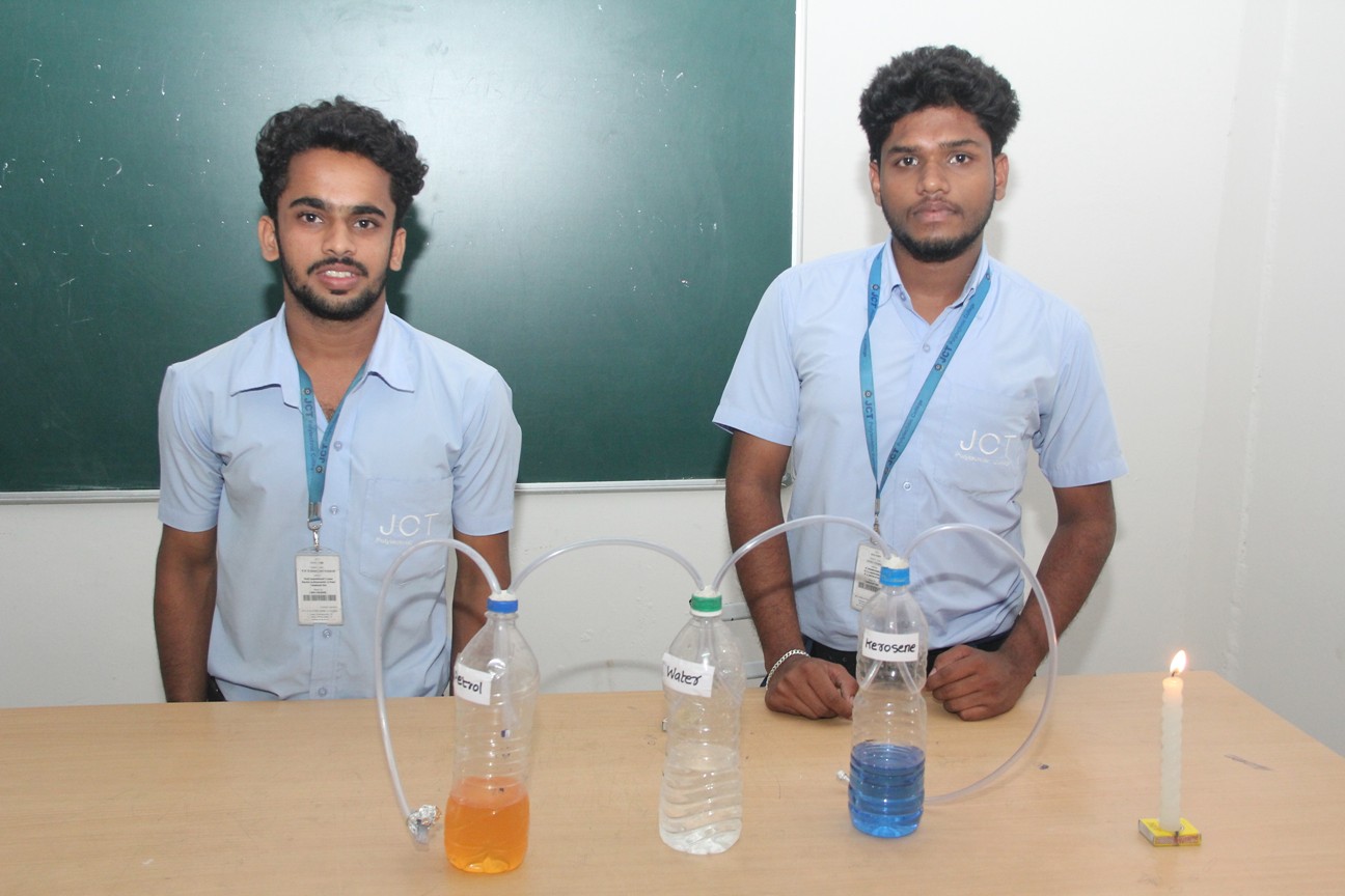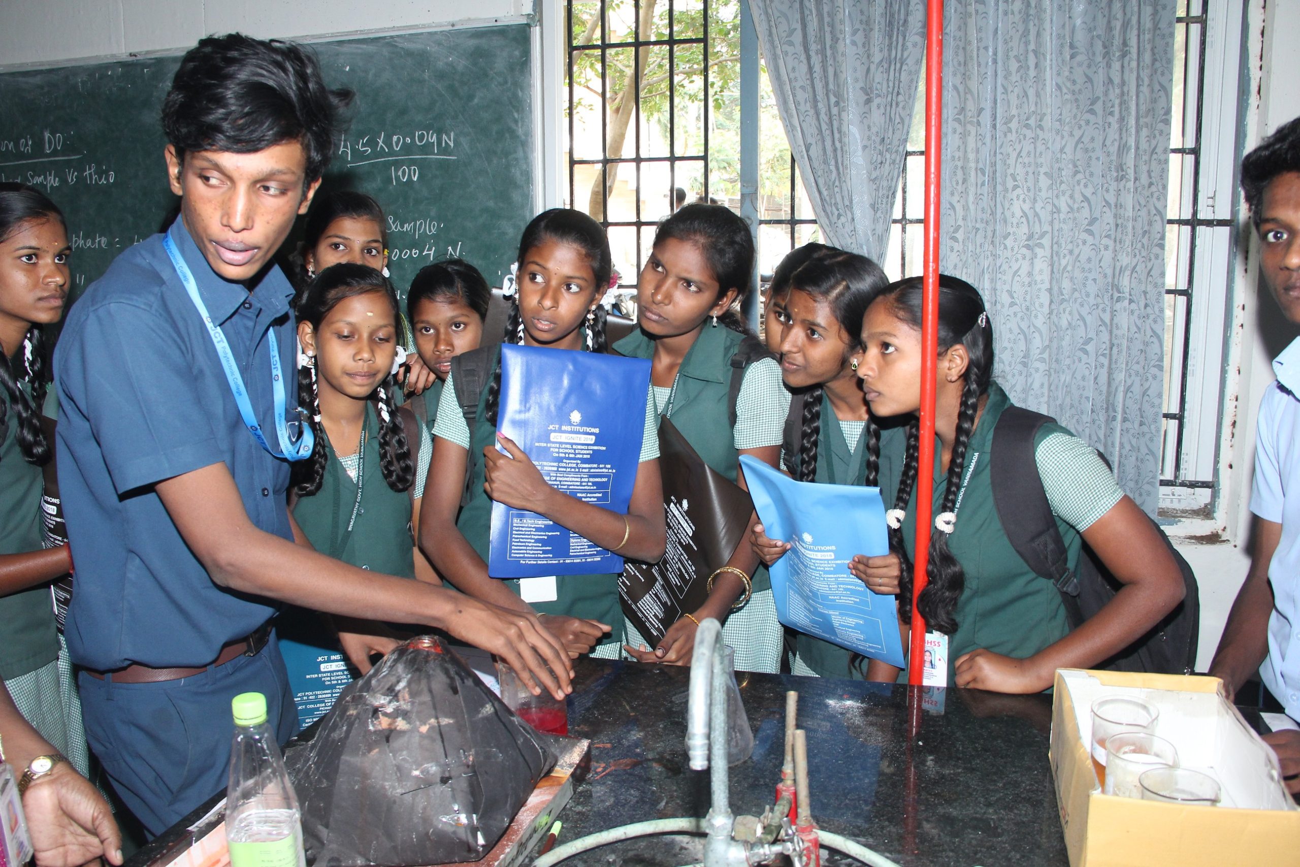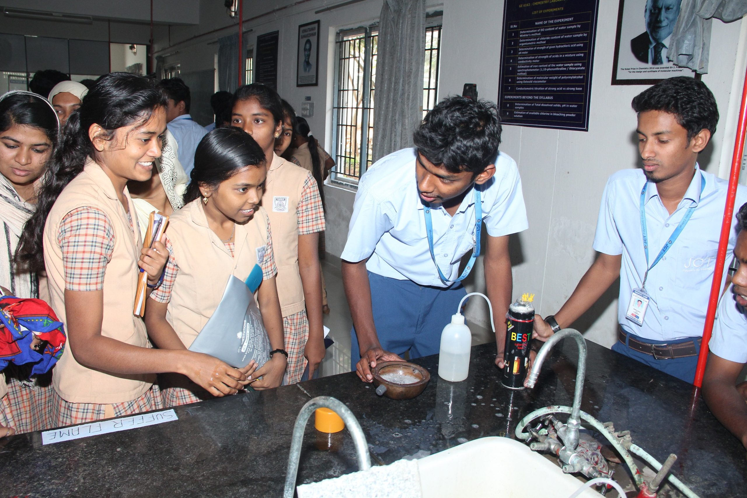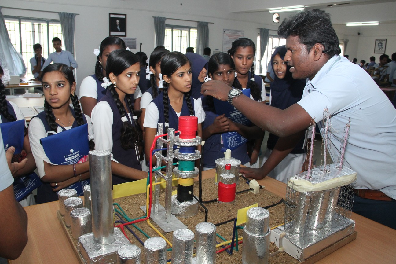 A total of 58 projects from Polytechnic students and 18 projects from School students were exhibited in Physics and Chemistry Labs of JCT CET. During the first day 468 students and the second day 205 students were participated from various schools. About 50 students from engineering college were also visited. A study kit which includes a file, pen, formula kit (10th and 12th std), Pocket 2018 Calendar with Public Exam Timetable, college broucher and exhibition broucher were distributed to all the participants along with refreshments. The accompanying teachers of respective schools were also honored with our Institution diary and Calendar. About 100 volunteers were also involved. To and from transport were arranged to all the school participants. Some of the accepted schools were unable to participate due to their last minute problems.